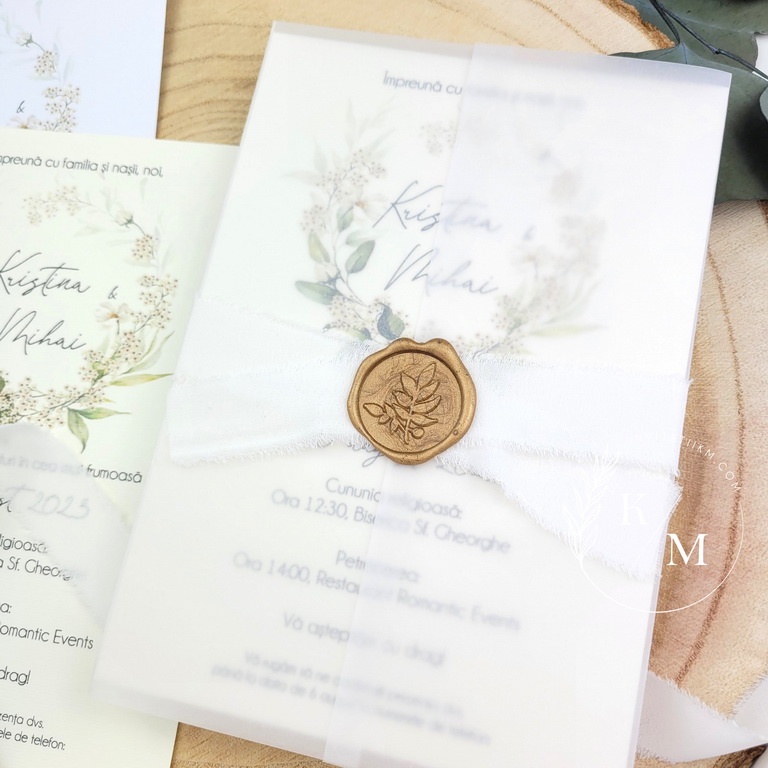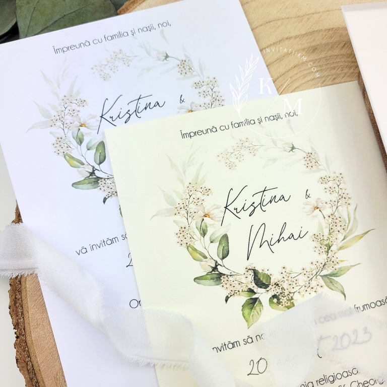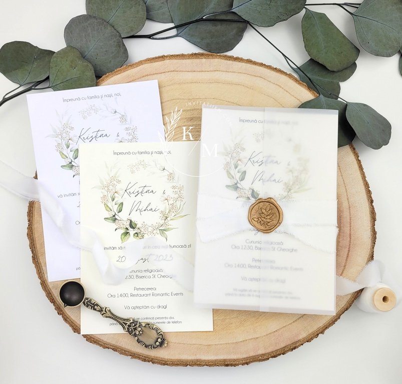 Invitatii de nunta florale, realizate din carton alb sau ivory, cu text simplu, coronita florala in nuante de alb, ivory, cu verdeata, invelite in hartie delicata de calc, legate cu panglica din voal de matase + sigiliu