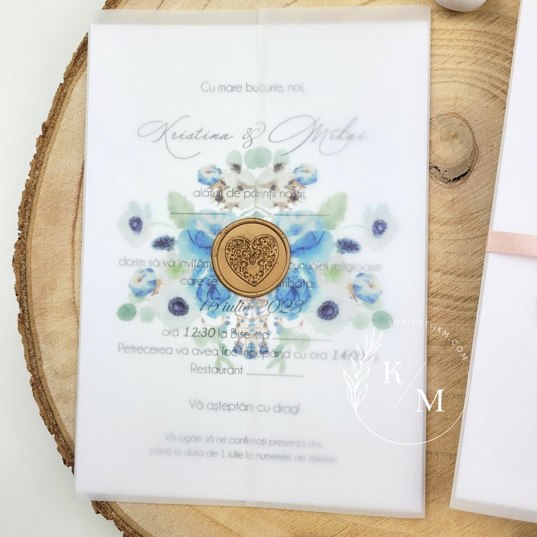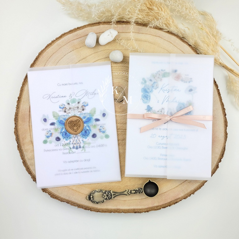 Invitatii de nunta florale, realizate din carton alb sau ivory, cu text simplu, buchete florale in nuante de alb si albastru, bleu si blush, cu verdeata, anemone si bumbac, invelite in hartie delicata de calc, legate cu fundite de buna calitate, care nu se desira/inchise cu sigiliu turnat la cald