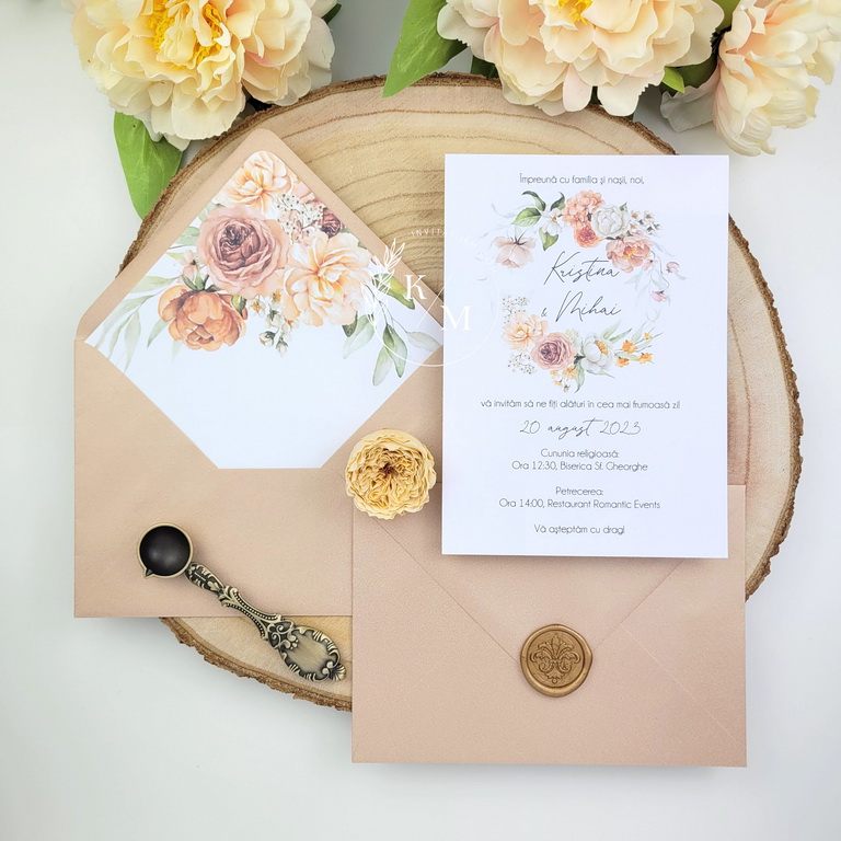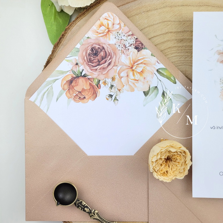 Invitatii de nunta florale, realizate din carton alb sau ivory, cu text simplu, buchete florale in culori pamantii, blush, piersica, albe, portocalii, accesorizate cu plic si liner in acelasi ton.