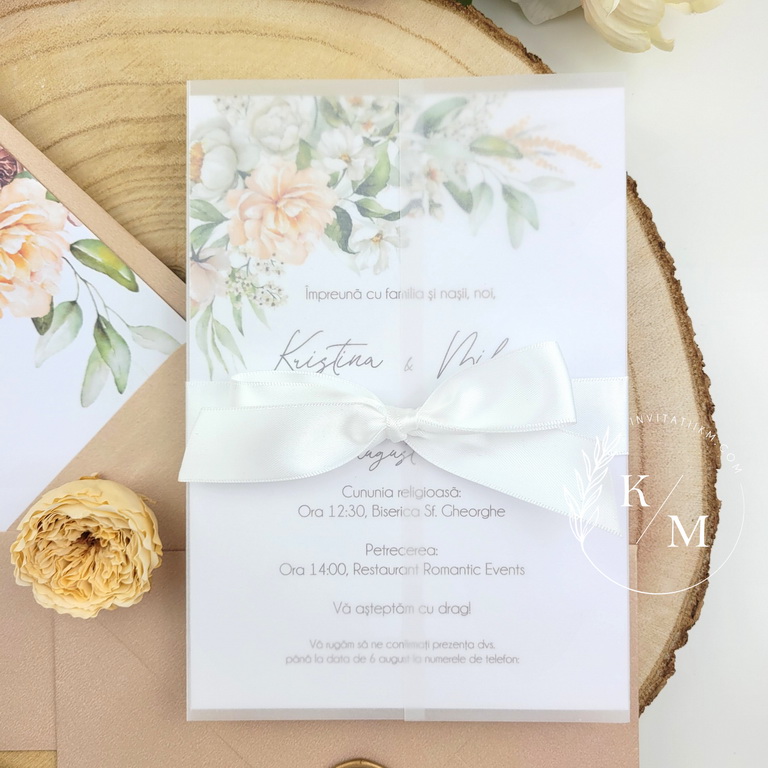 Invitatii de nunta florale, realizate din carton alb sau ivory, cu text simplu, buchete florale in nuante de alb, ivory, piersica, cu verdeata, invelite in hartie delicata de calc, legate cu fundite de buna calitate, care nu se desira