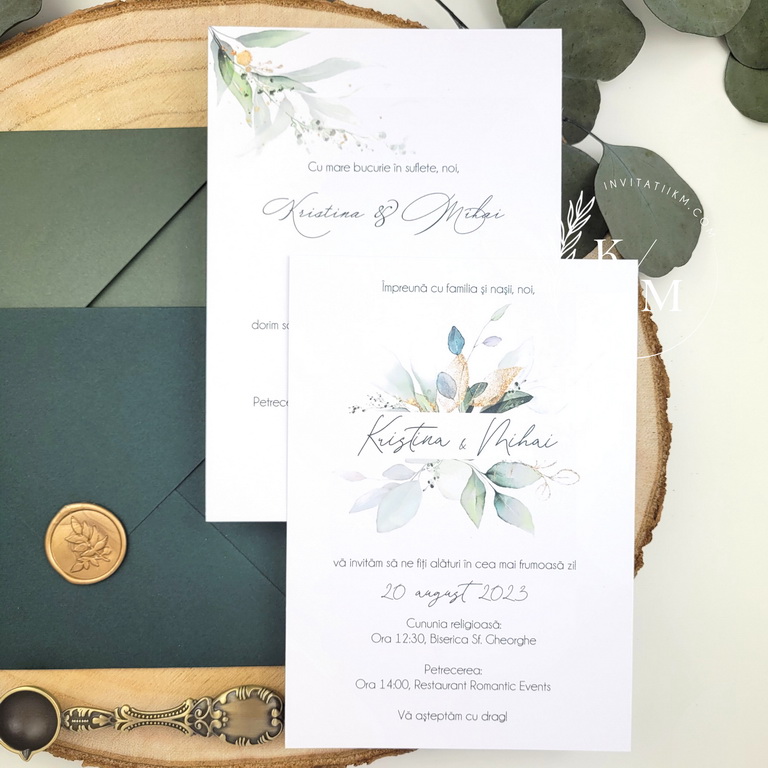 Invitatii de nunta greenery, realizate din carton alb sau ivory, cu text simplu, verdeata si frunze de eucalipt, accesorizate cu plic si sigiliu