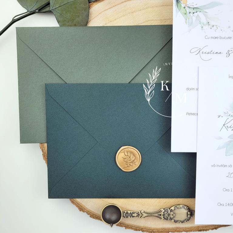 In imagini: invitatie din carton alb neted + plic verde foarte inchis + sigiliu: 7.5 lei