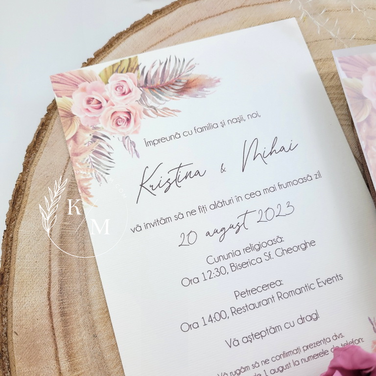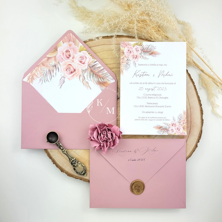 Invitatii de nunta florale, realizate din carton alb sau ivory, cu text simplu, buchete florale in stil boho, cu iarba de pampas, trandafiri roz antic, accesorizate cu plic, liner in acelasi ton si cu sigiliu turnat direct pe plic.