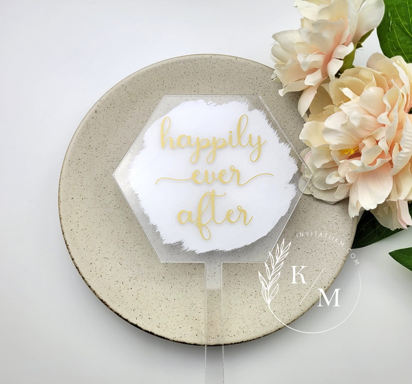Topper pentru tort realizat din plexiglas transparent, personalizat cu text din autocolant auriu si vopsit in diverse culori. Se pot realiza la fel si numere de masa, carduri de asezare, semne de carte.