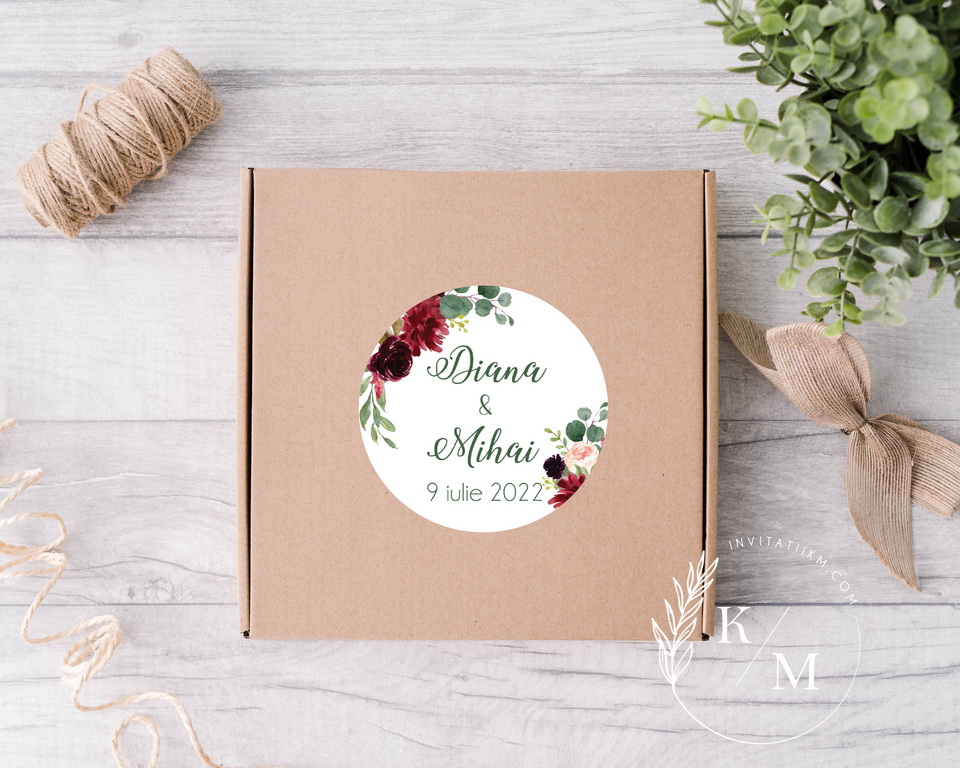 Stickere, etichete autoadezive cu flori bordeaux, burgundy, pentru marturii de nunta/botez. Pot fi realizate din autocolant mat/lucios pentru a fi lipite sau pot fi din carton cu gaurica pentru a fi legate (se livreaza fara snur/sfoara).