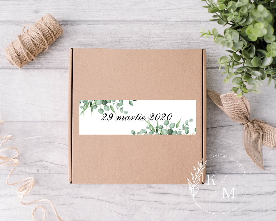 Stickere, etichete autoadezive cu frunze de eucalipt/verdeata, pentru borcanase marturii de nunta/botez. Pot fi realizate din autocolant mat/lucios pentru a fi lipite sau pot fi din carton cu gaurica pentru a fi legate (se livreaza fara snur/sfoara).