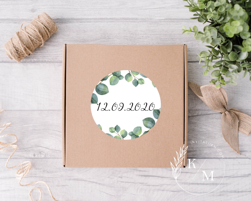 Stickere, etichete autoadezive cu frunze de eucalipt/verdeata, pentru marturii de nunta/botez. Pot fi realizate din autocolant mat/lucios pentru a fi lipite sau pot fi din carton cu gaurica pentru a fi legate (se livreaza fara snur/sfoara).