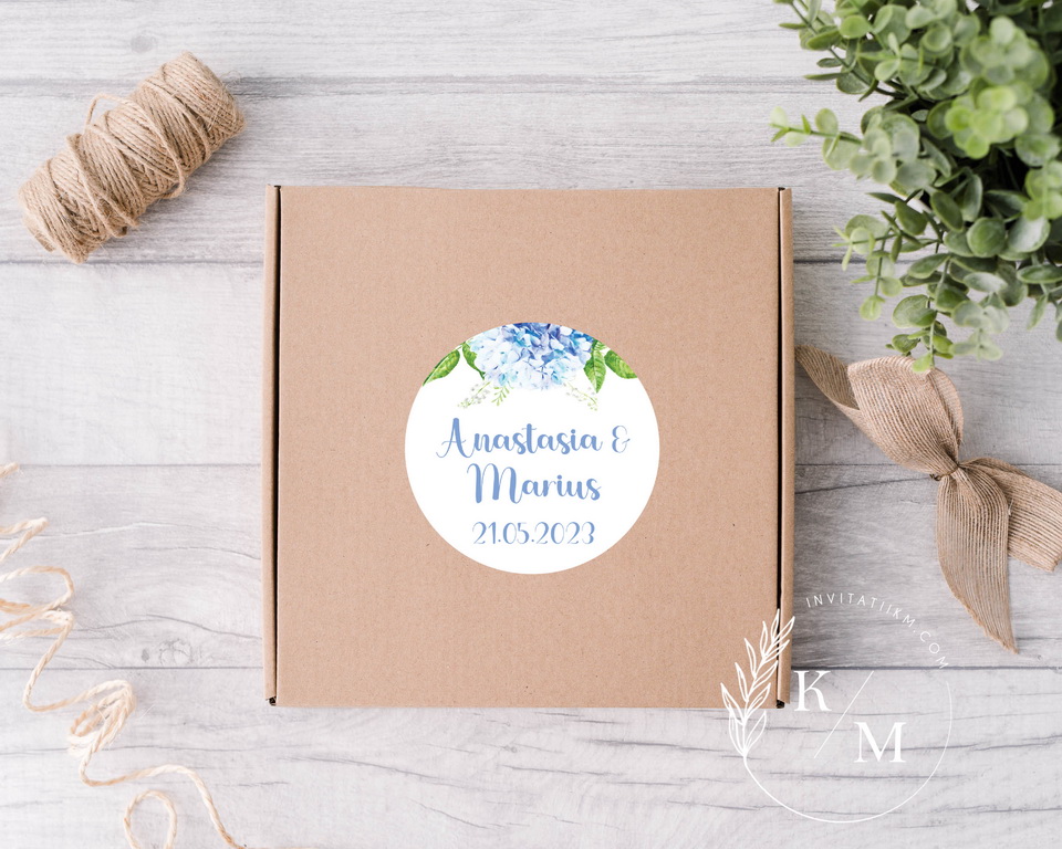 Stickere, etichete autoadezive cu hortensii albastre/bleu, pentru marturii de nunta/botez. Pot fi realizate din autocolant mat/lucios pentru a fi lipite sau pot fi din carton cu gaurica pentru a fi legate (se livreaza fara snur/sfoara).