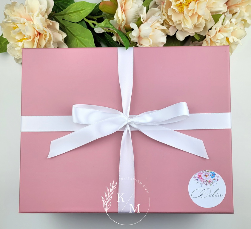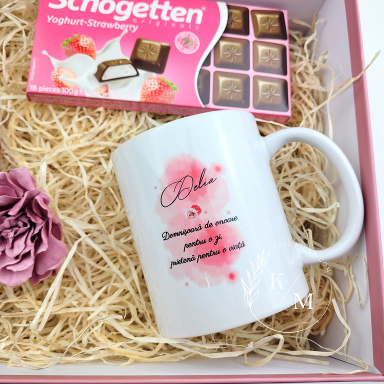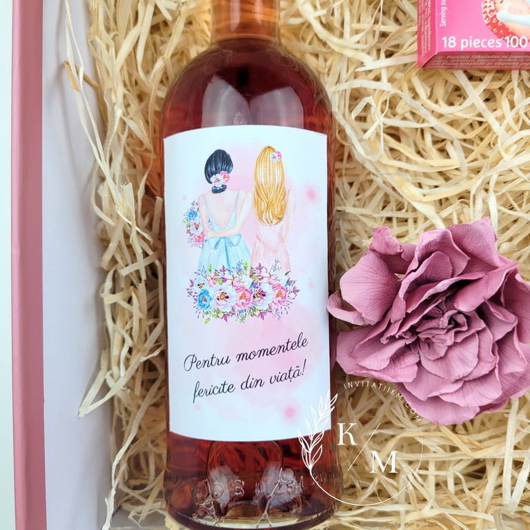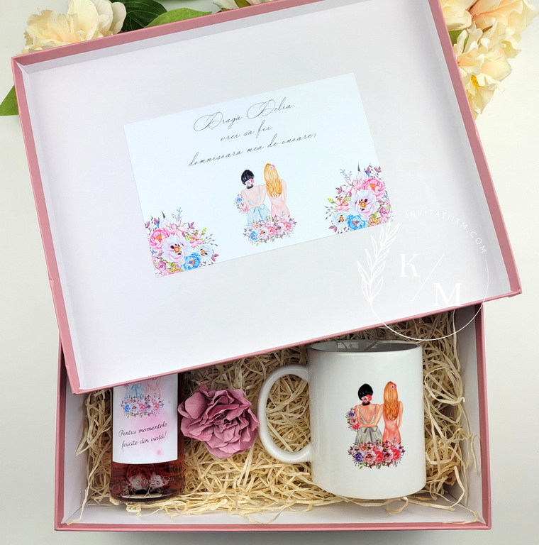 - cutie din carton premium roz antic/prafuit + fundita asortata si sticker cu nume, iar pe interior un sticker cu textul “Draga x, vrei sa fii domnisoara mea de onoare?”