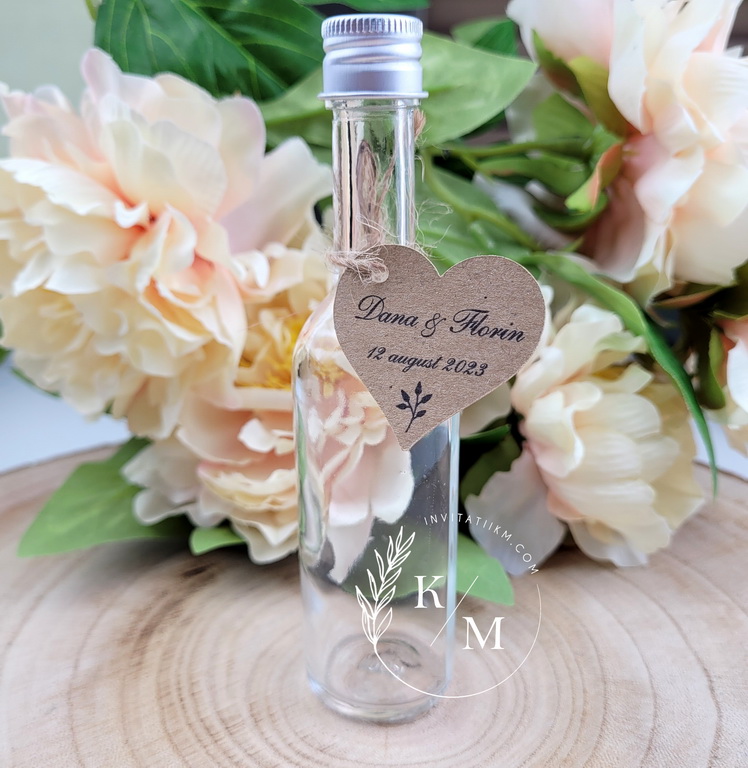 Etichete pentru marturii de nunta in stil rustic realizate din carton reciclat, decupate in forma de inimioara