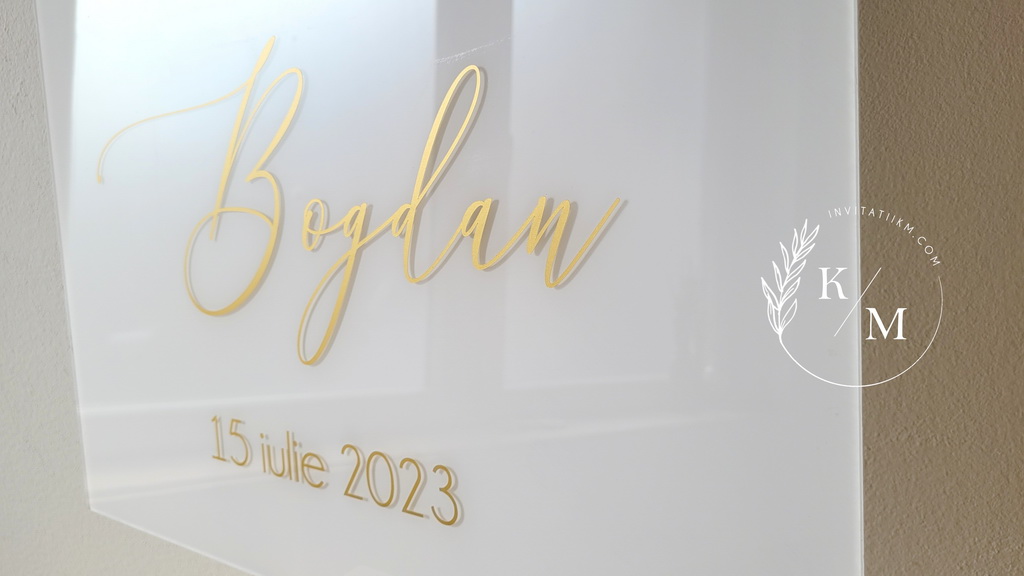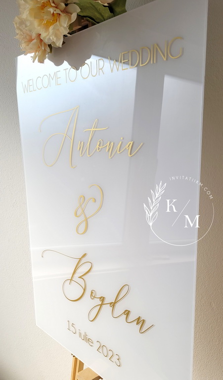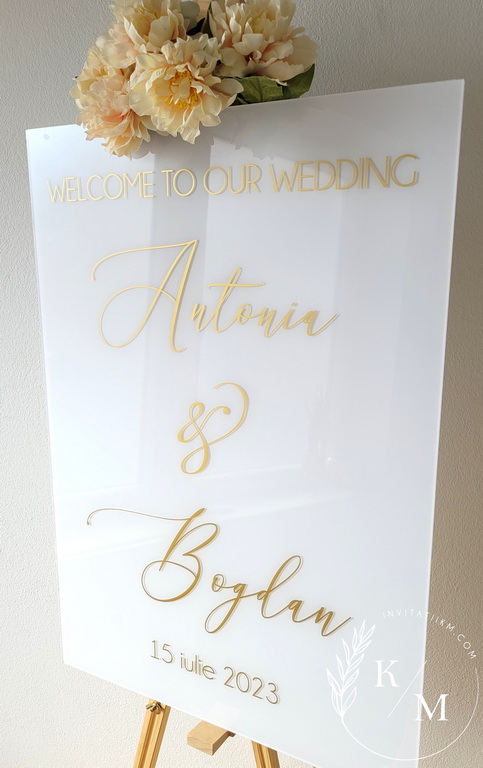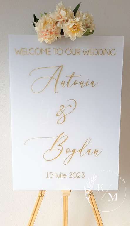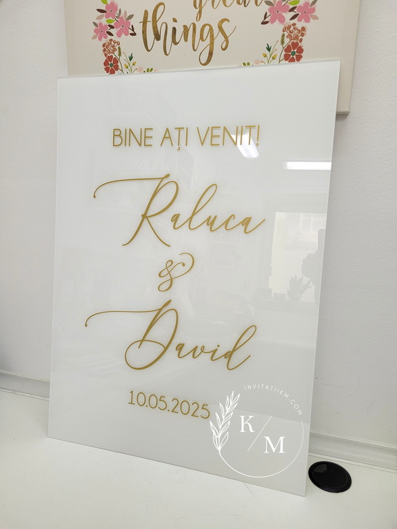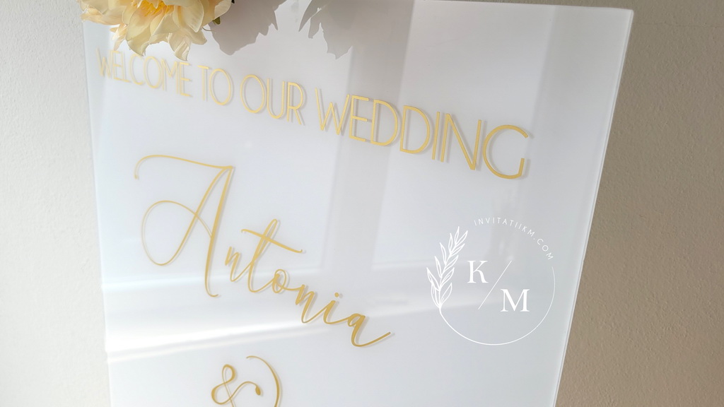 Panou de intampinare a invitatilor pentru nunta sau botez, realizat din plexiglas transparent, personalizat cu text din autocolant auriu si vopsit alb complet.