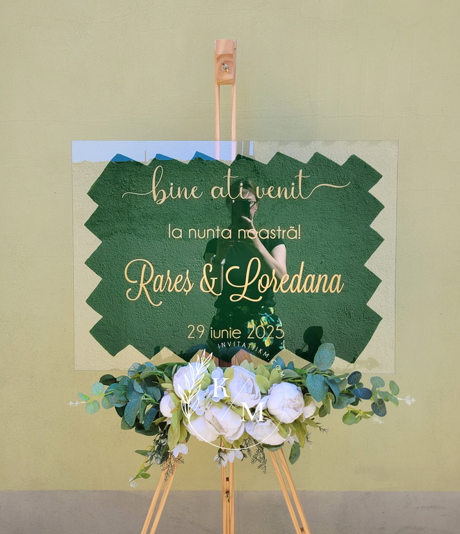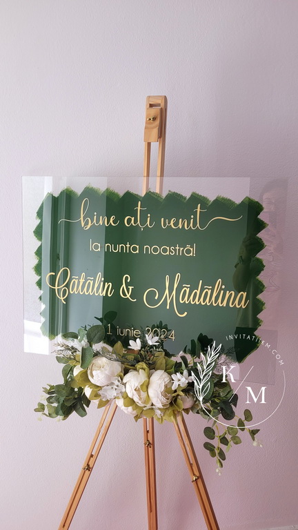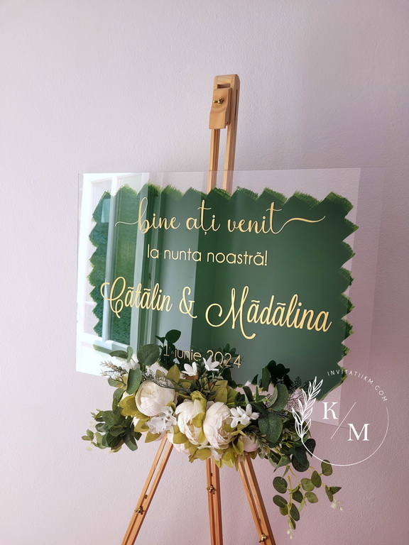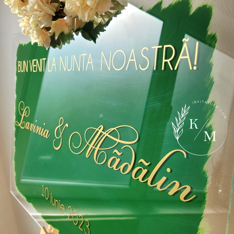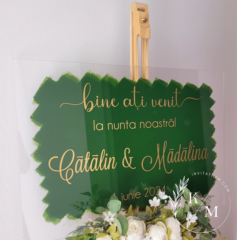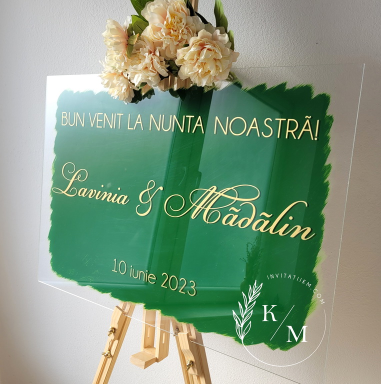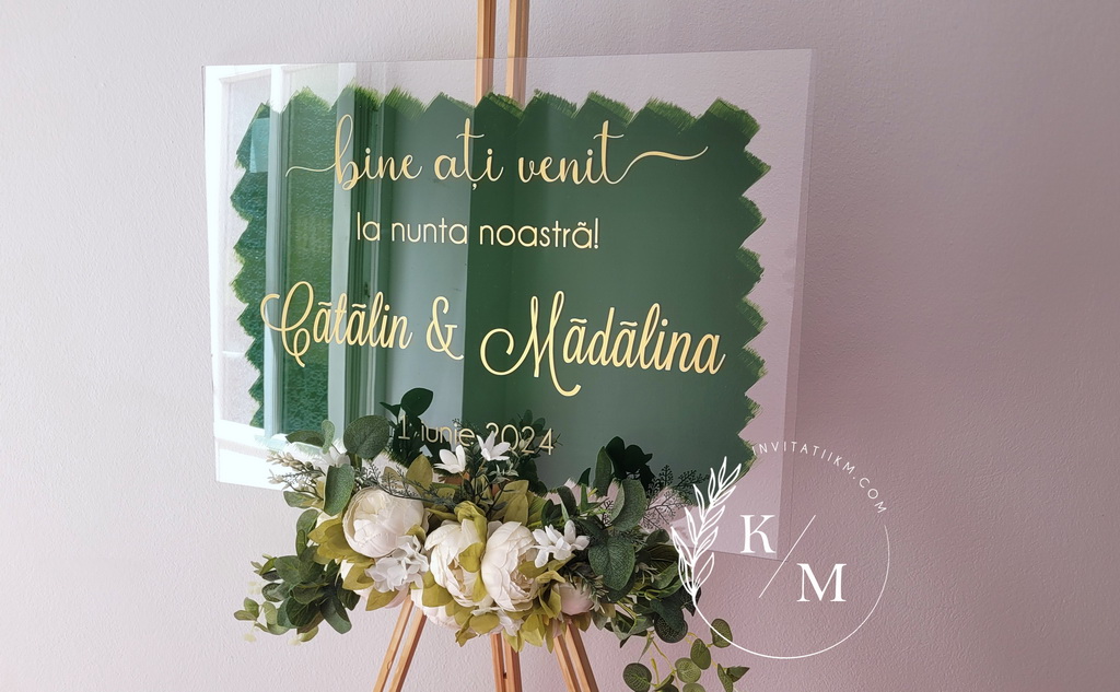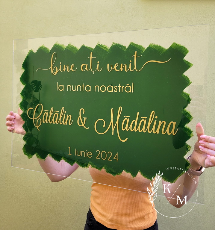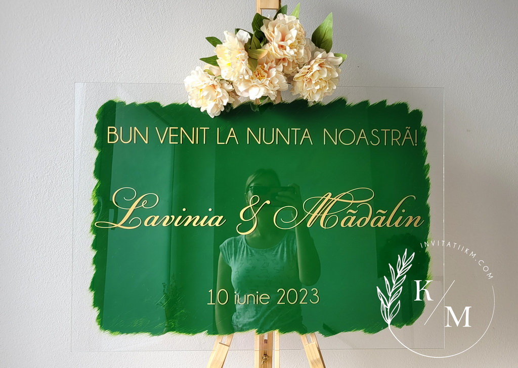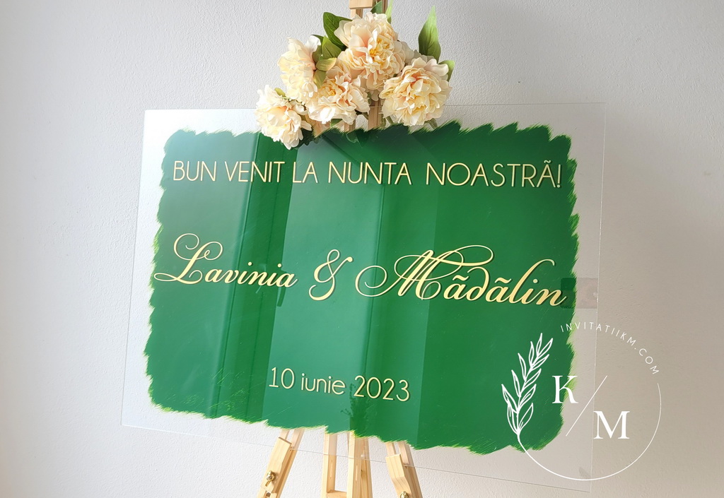 Panou de intampinare a invitatilor pentru nunta sau botez, realizat din plexiglas transparent, personalizat cu text din autocolant auriu si vopsit in diverse culori.