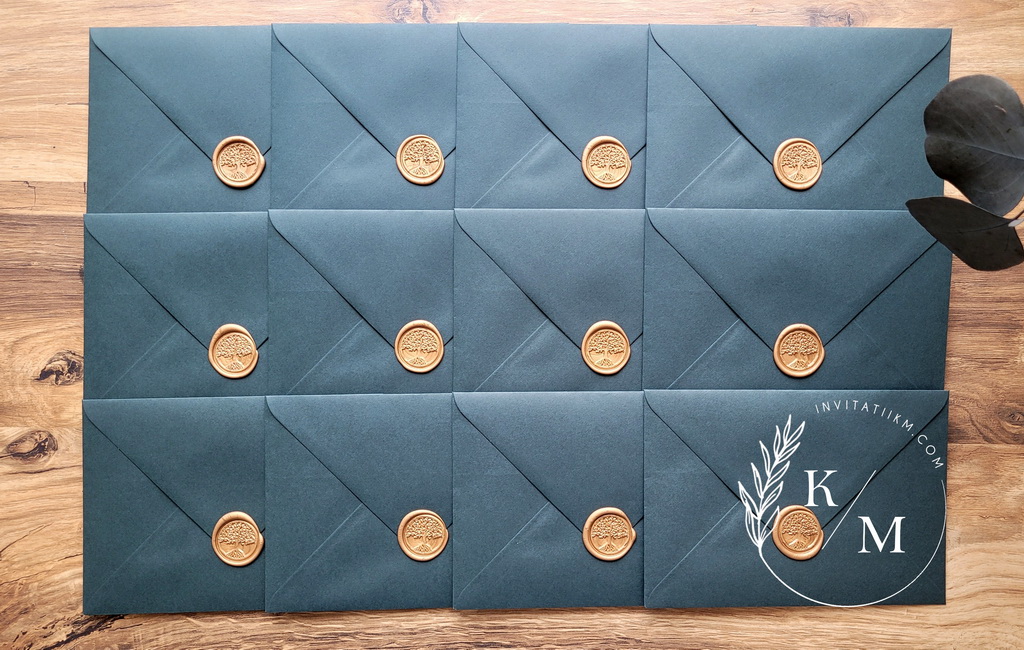 Invitatii de nunta cu frunze de eucalipt, plicuri handmade verde inchis si sigilii