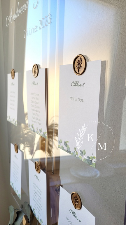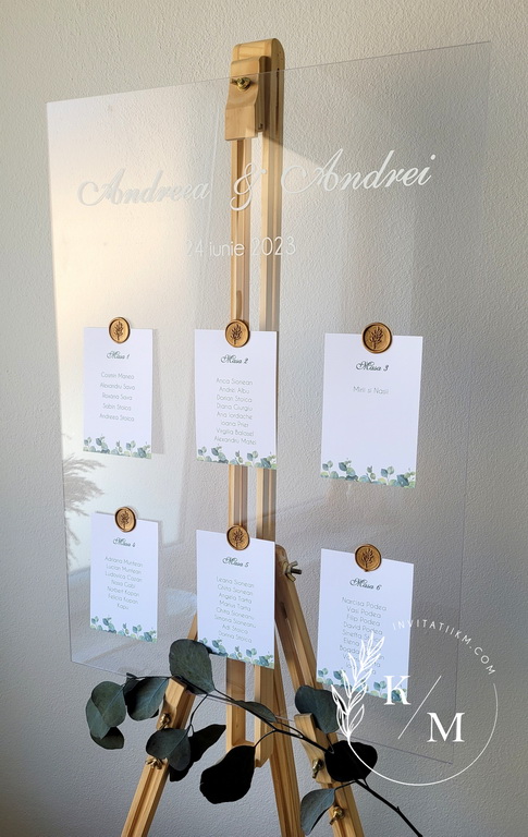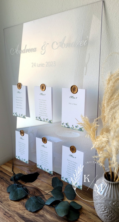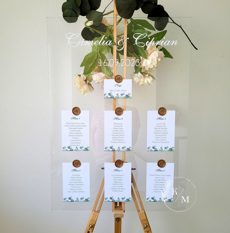 Panou de intampinare pentru nunta cu cartonase cu asezarea invitatilor la mese. Panoul este realizat din plexiglas transparent, are dimensiunea 50 x 70 cm, iar cartonasele sunt realizate din carton alb neted + sigiliu. In functie de numarul cartonaselor, acestea pot fi mai mari/mai micute. Se pot achizitiona impreuna sau separat.