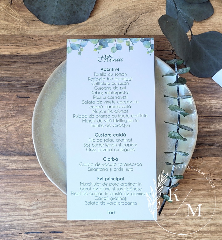 Meniu individual pentru nunta/botez realizat din carton alb sau ivory. Meniul poate fi asezat pe fiecare farfurie in parte.