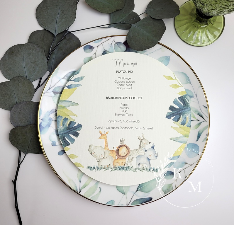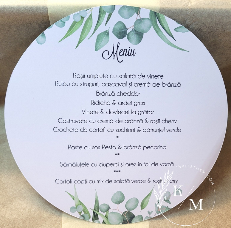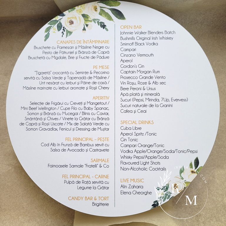 Meniu rotund pentru nunta/botez realizat din carton alb sau ivory. Meniul poate fi asezat pe fiecare farfurie in parte.
