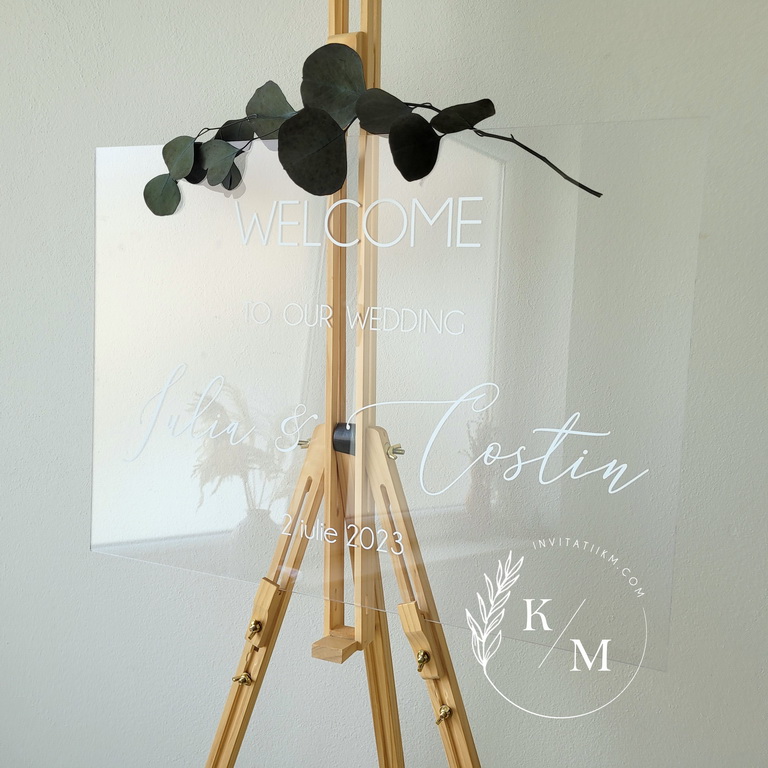 Panou de intampinare a invitatilor la nunta sau botez, realizat din plexiglas transparent, personalizat cu text din autocolant auriu sau alb mat.