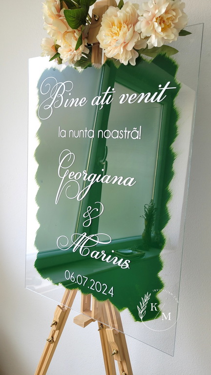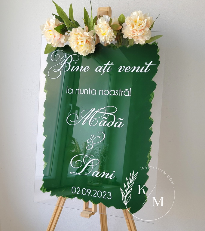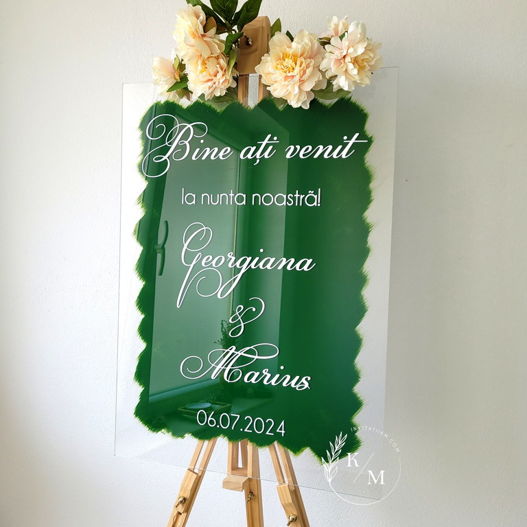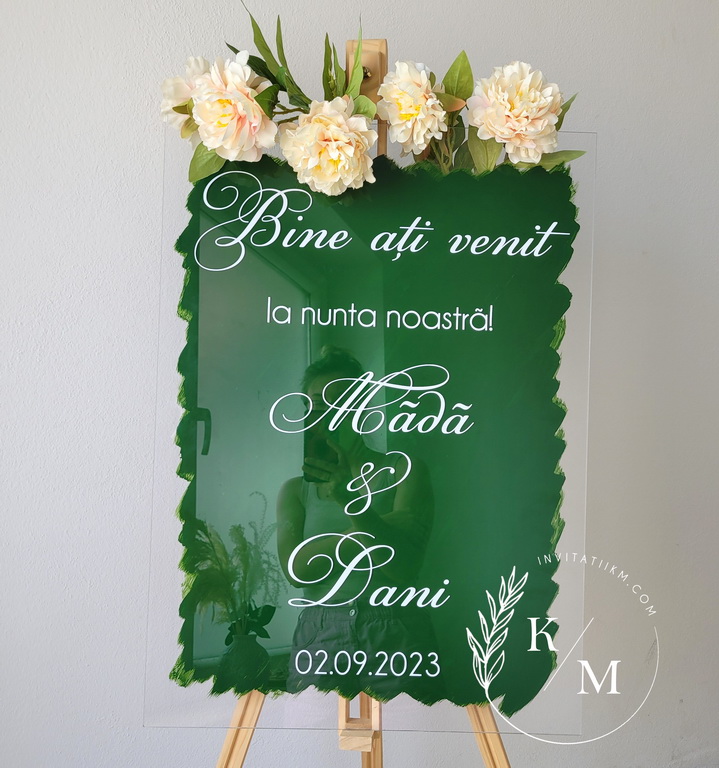 Panou de intampinare a invitatilor pentru nunta sau botez, realizat din plexiglas transparent, personalizat cu text din autocolant alb si fundal vopsit verde smarald.