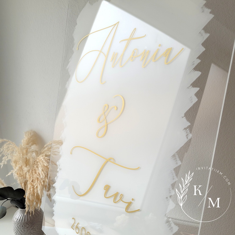 Panou de intampinare a invitatilor pentru nunta sau botez, realizat din plexiglas transparent, personalizat cu text din autocolant auriu si vopsit in diverse culori.