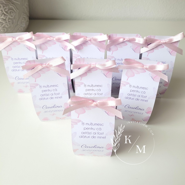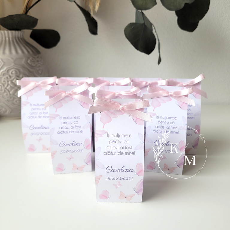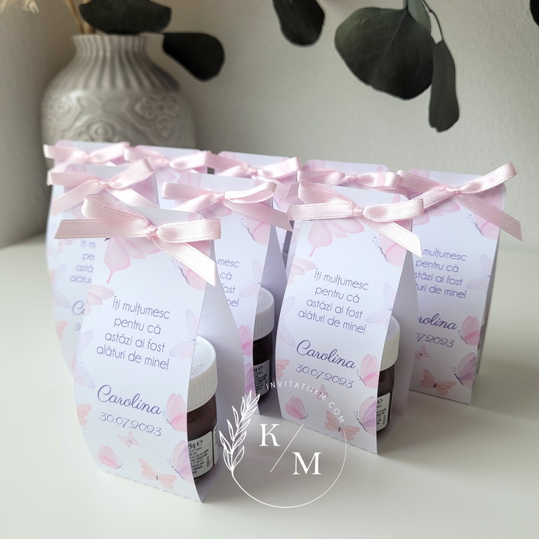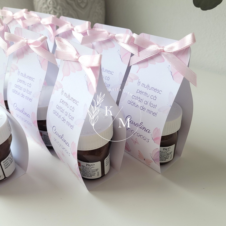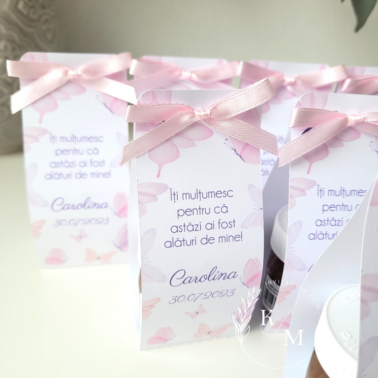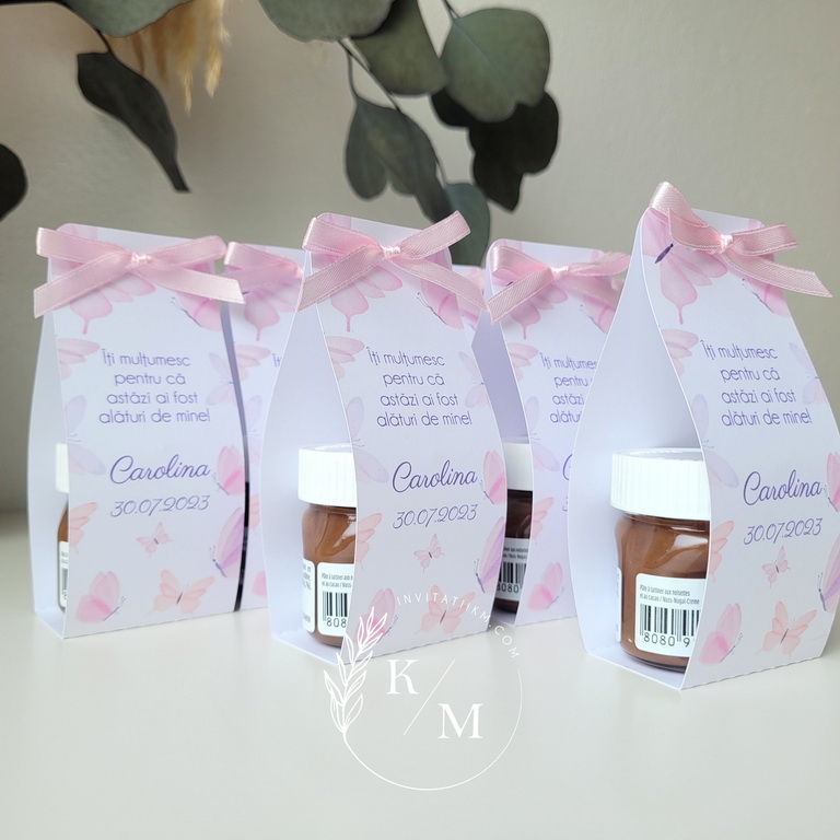 Cartonase pentru marturii de botez/cutii pentru marturii de botez ce pot fi folosite pentru borcanase de Nutella, borcanase de miere/dulceata sau pentru lumanari bubble – dimensiunile se pot modifica in functie de necesitate. In partea de sus au una sau doua gaurele pentru a lega funditele iar la baza sunt biguite pentru a fi indoite. Mai multe produse pentru botez aici: https://invitatiidebotez.com/