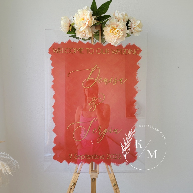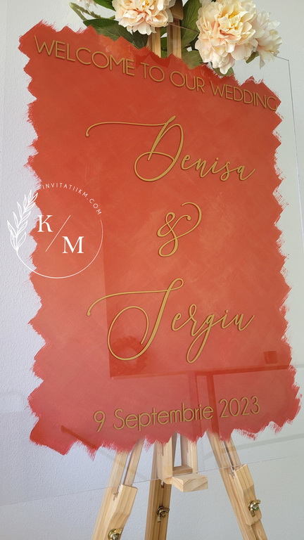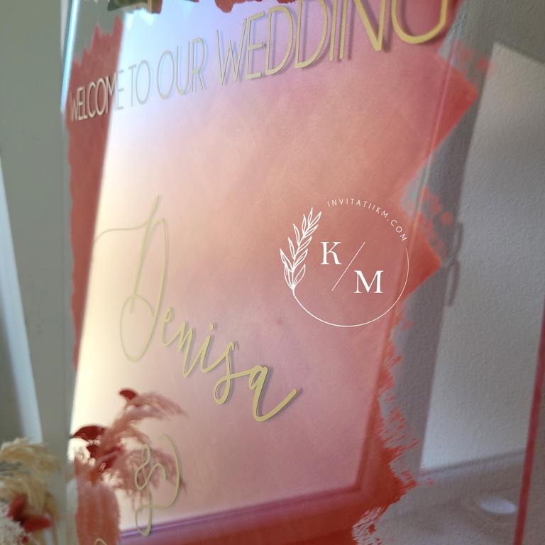 Panou de intampinare a invitatilor pentru nunta, realizat din plexiglas transparent, personalizat cu text din autocolant auriu si vopsit in nuanta de cupru rosu.