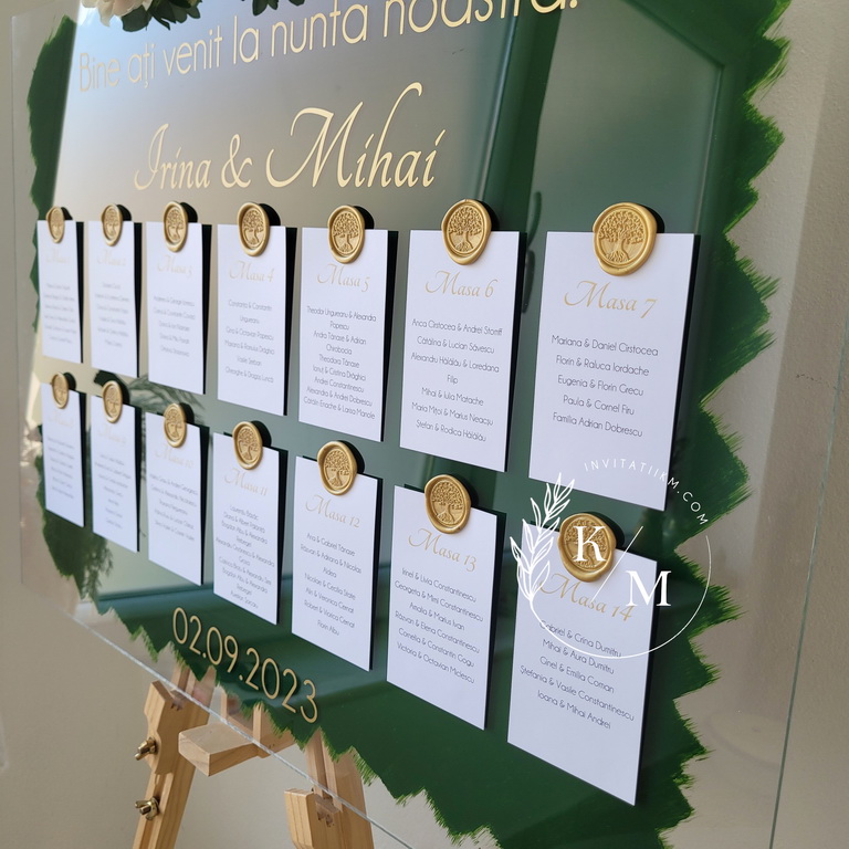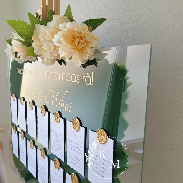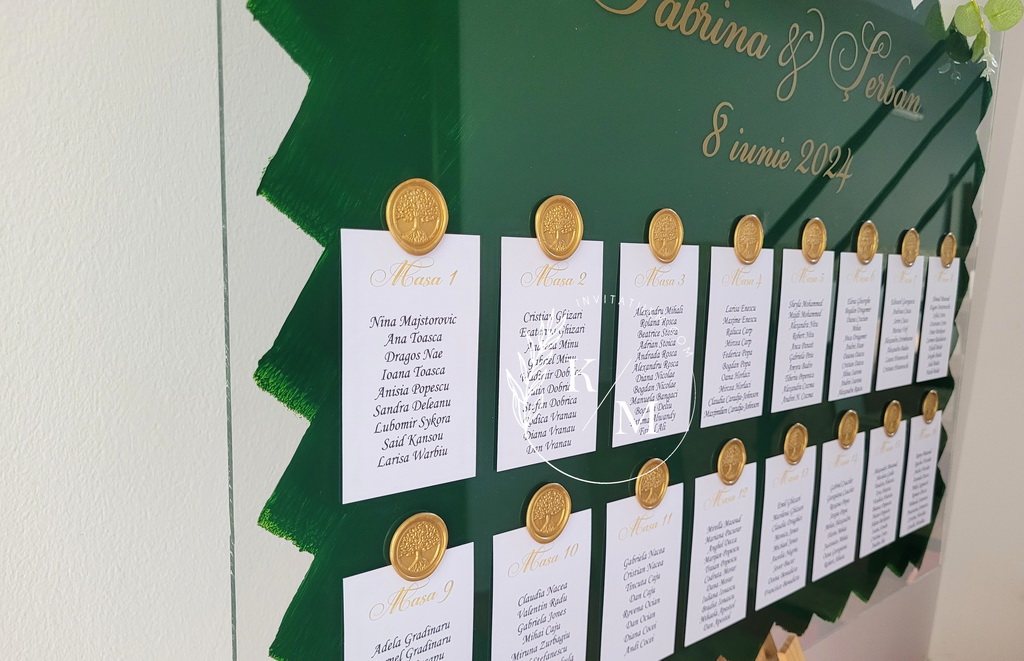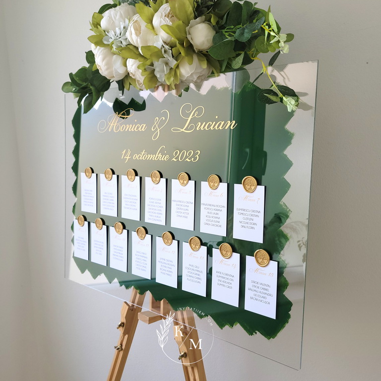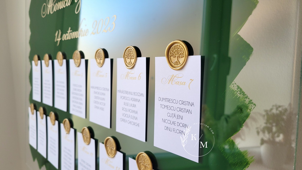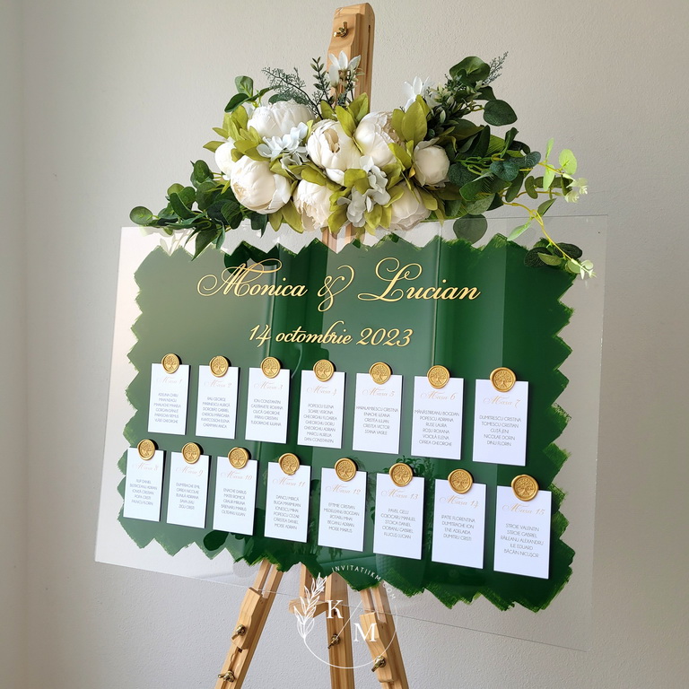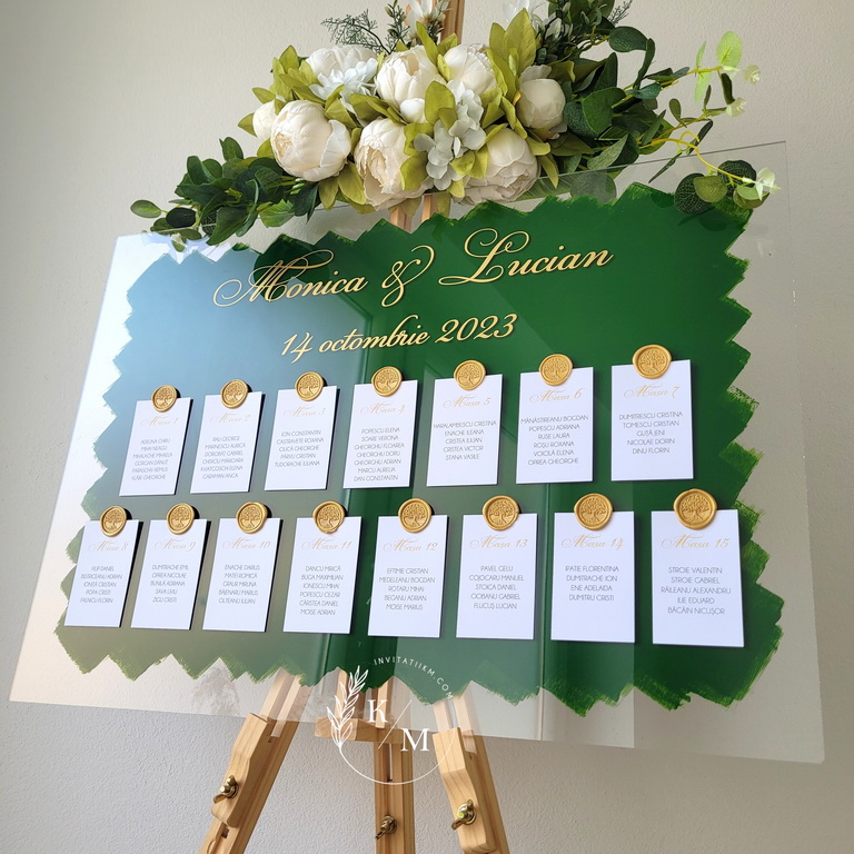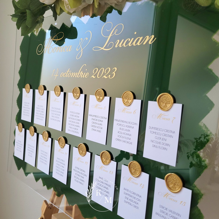 Panou de intampinare pentru nunta cu cartonase cu asezarea invitatilor la mese. Panoul este realizat din plexiglas transparent vopsit verde pe verso, are dimensiunea 50 x 70 cm, iar cartonasele sunt realizate din carton alb neted + sigiliu. In functie de numarul cartonaselor, acestea pot fi mai mari/mai micute. Se pot achizitiona impreuna sau separat.