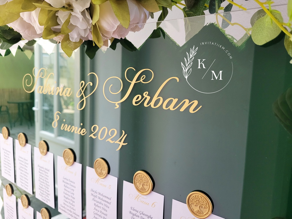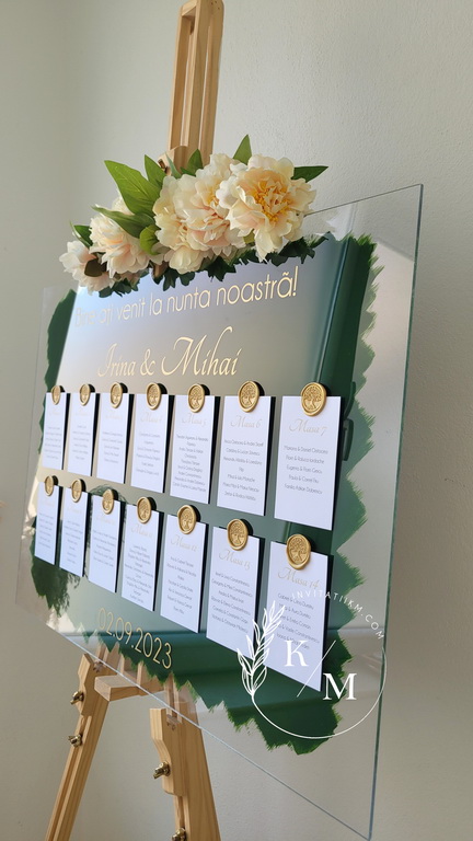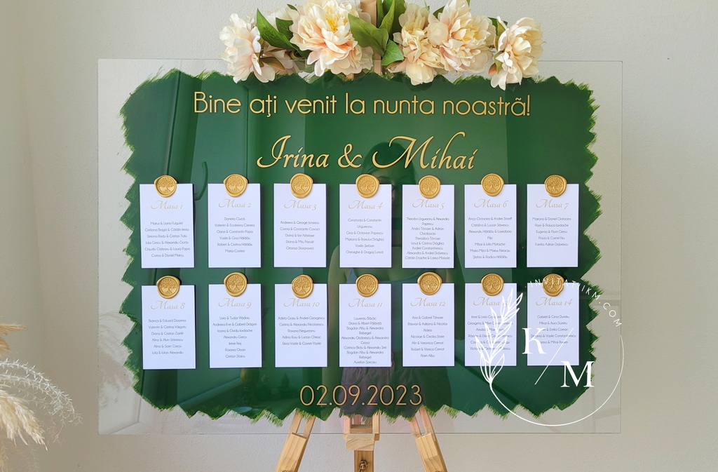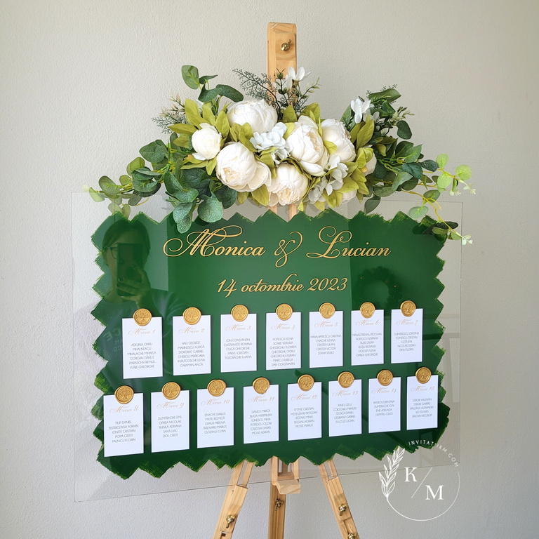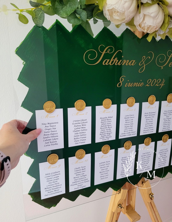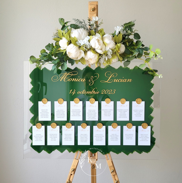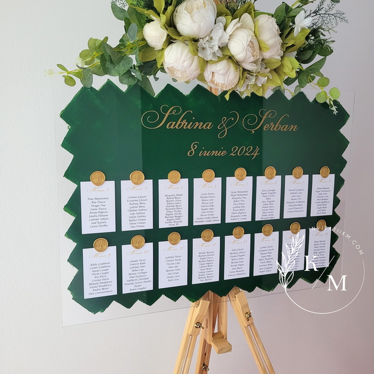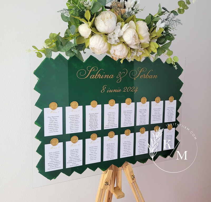 Panou de intampinare pentru nunta cu cartonase cu asezarea invitatilor la mese. Panoul este realizat din plexiglas transparent vopsit verde pe verso, are dimensiunea 50 x 70 cm, iar cartonasele sunt realizate din carton alb neted + sigiliu. In functie de numarul cartonaselor, acestea pot fi mai mari/mai micute. Se pot achizitiona impreuna sau separat.