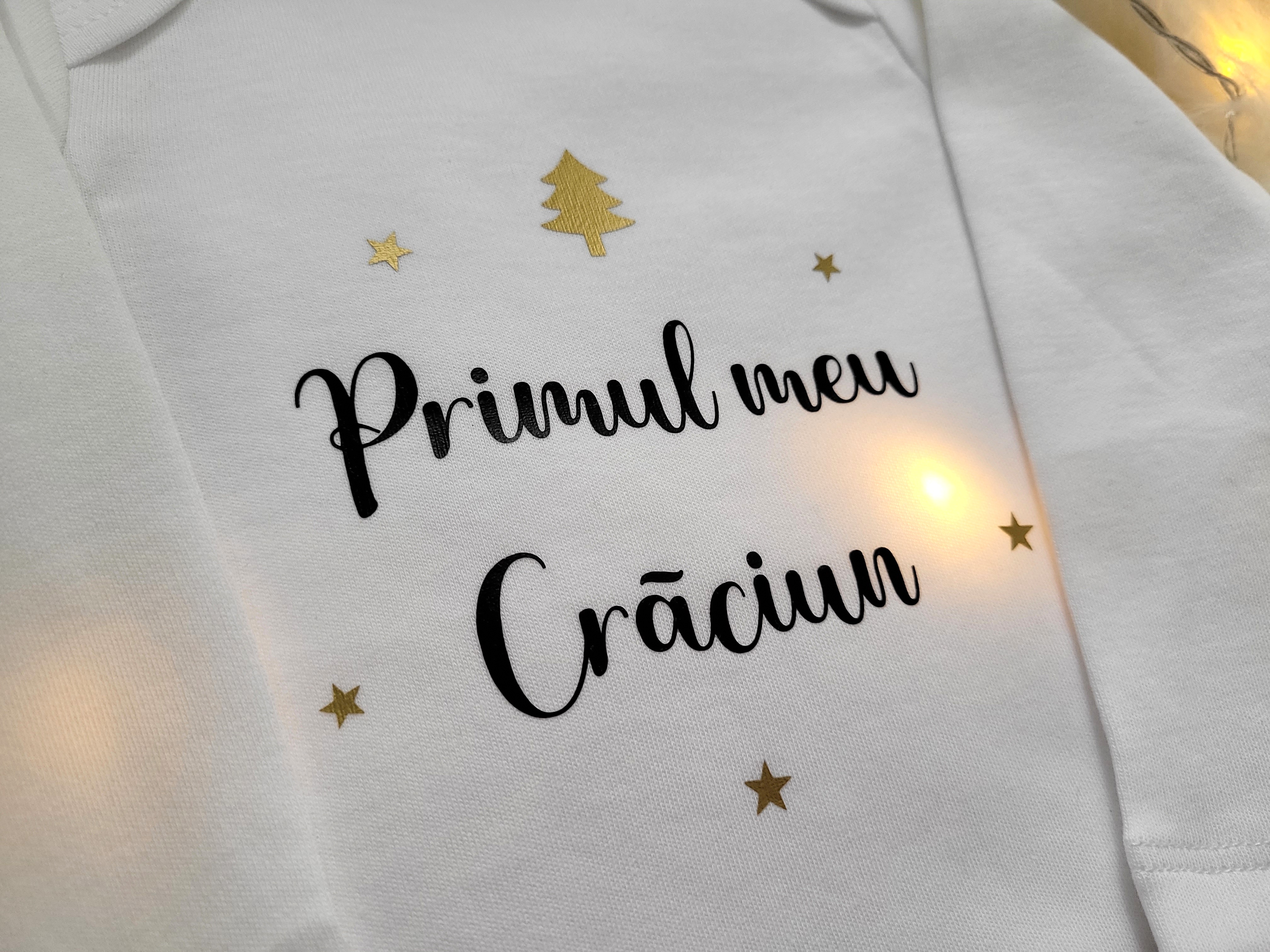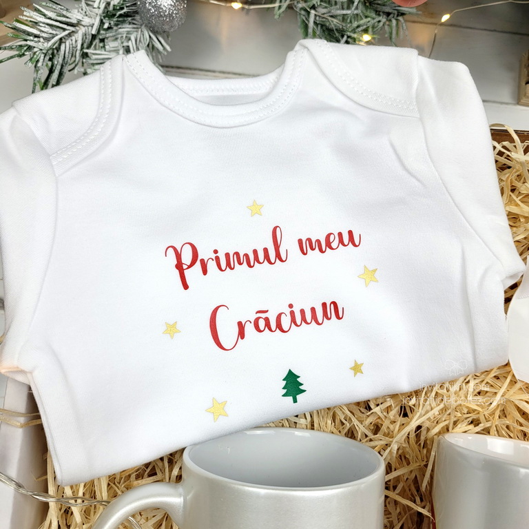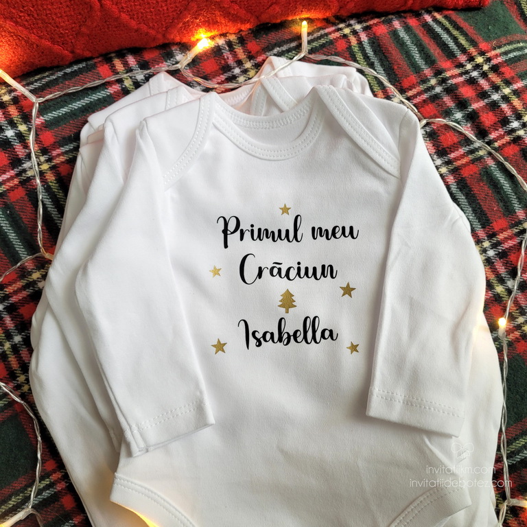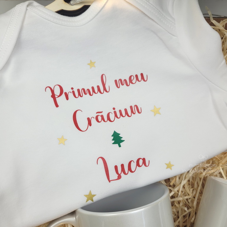 Idei mesaje: Primul meu Craciun + nume, nume + Primul Craciun cu mami si tati, Eu sunt bucuria Craciunului + nume, Minunea lui mami si tati + nume, Baby + nume copil etc.