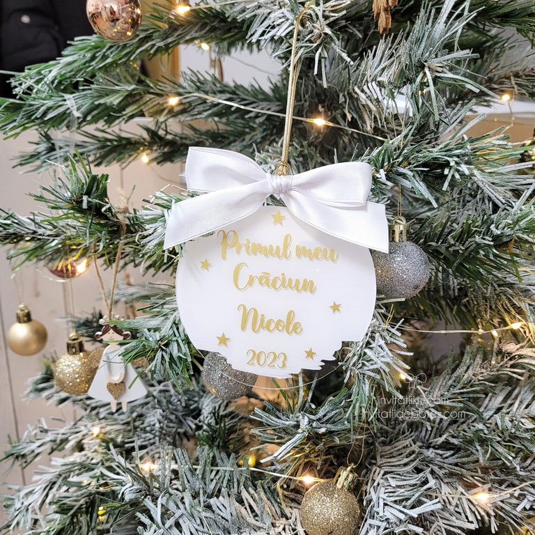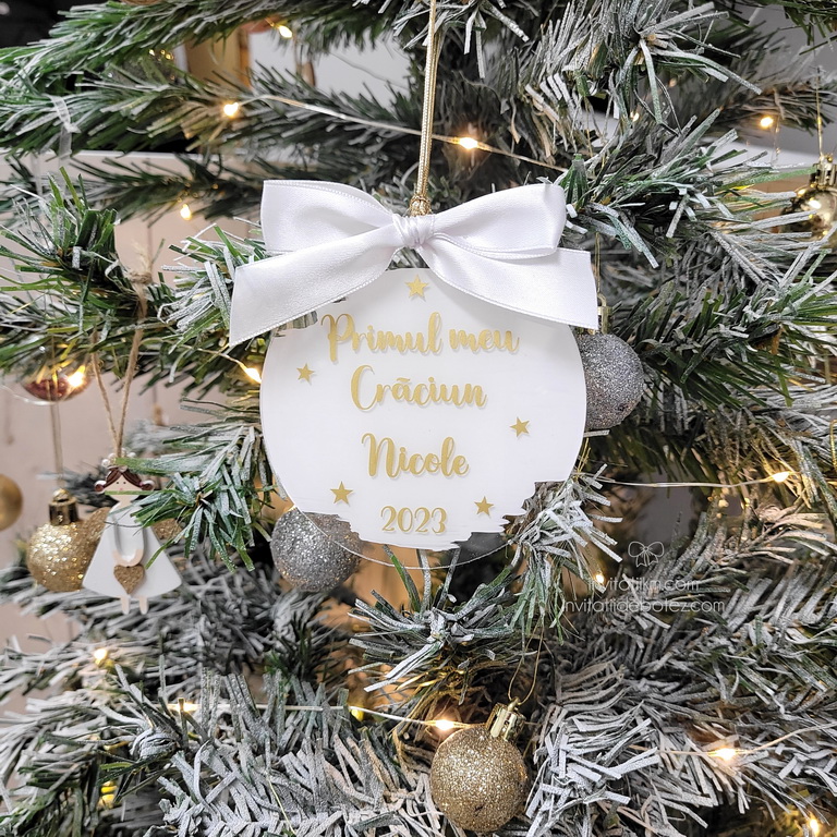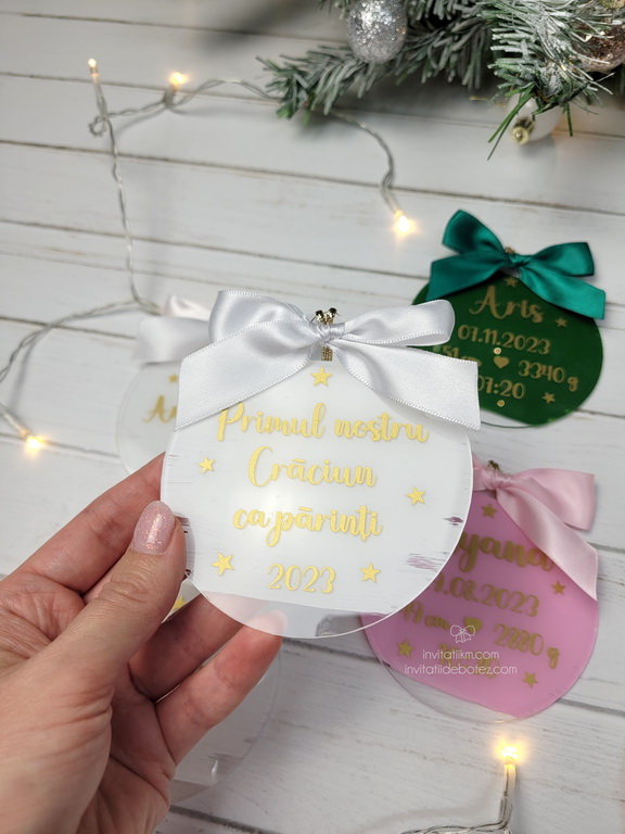 Ornamente de Craciun personalizate cu nume sau texte (Craciun fericit, Craciun magic, Primul Craciun impreuna, Primul Craciun in 2/3/4 etc).