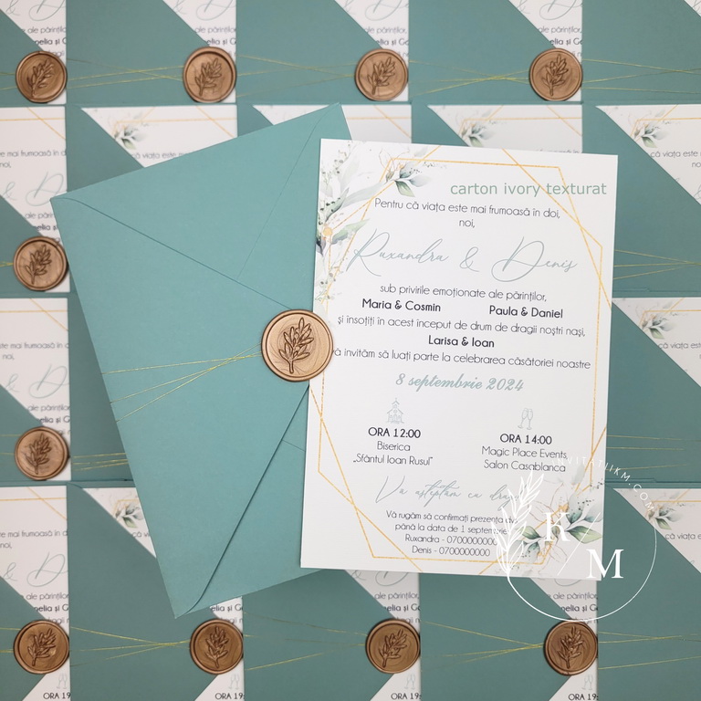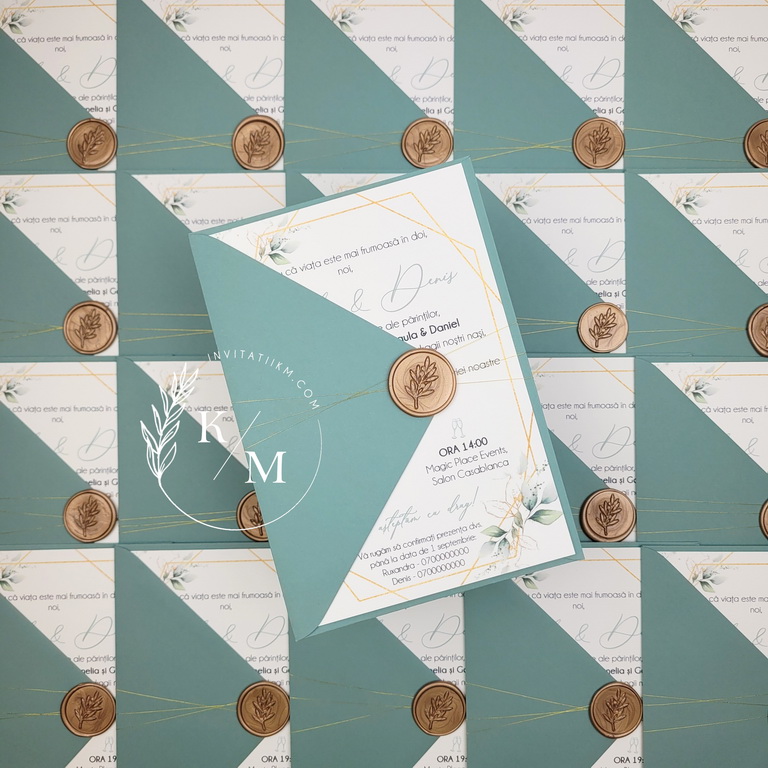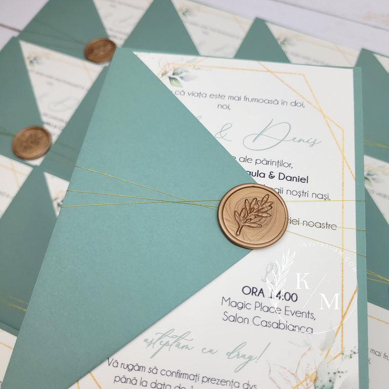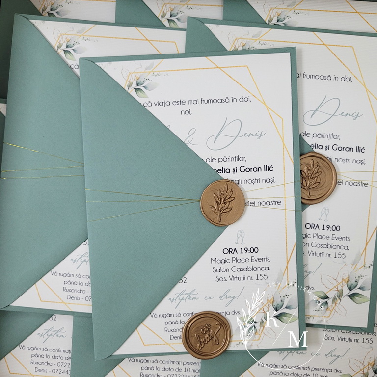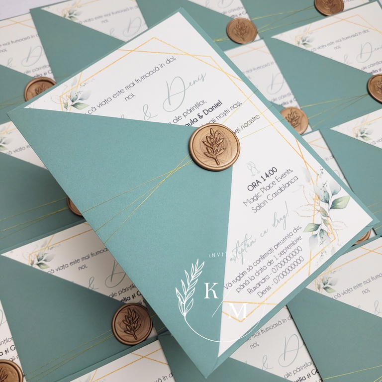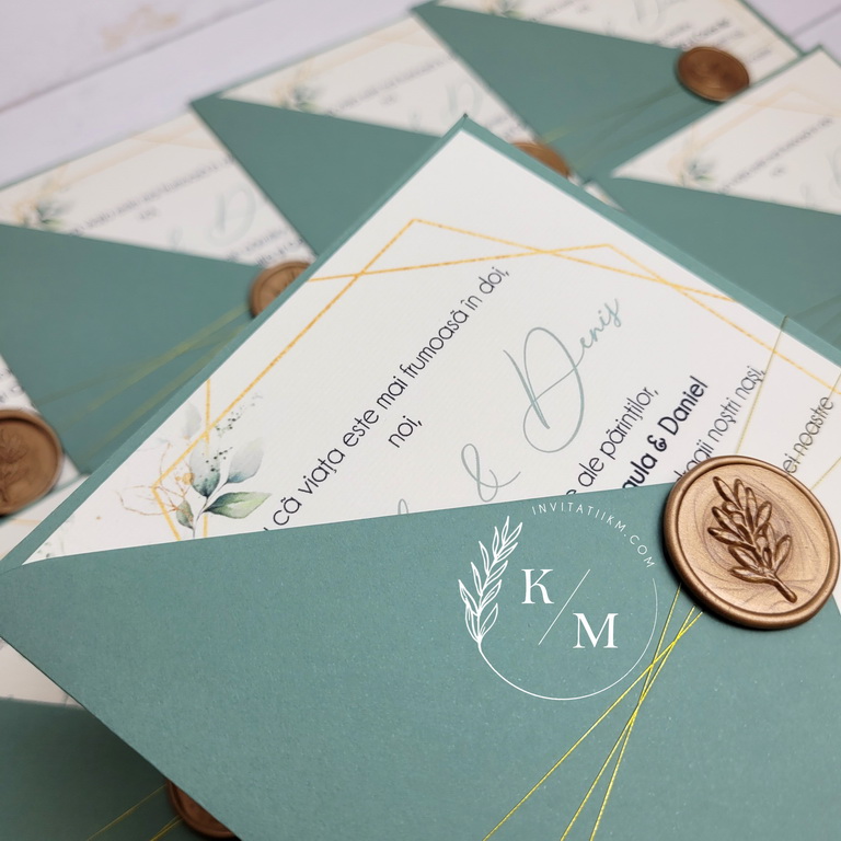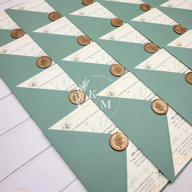 Invitatii de nunta cu tematica greenery si sigilii. Invitatiile de nunta greenery sunt realizate din carton ivory texturat, chenar auriu si verdeata, plic verde intr-o nuanta deosebita, snur auriu si sigiliu cu frunze.