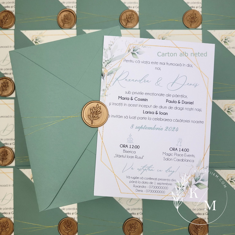 Invitatii de nunta cu tematica greenery si sigilii. Invitatiile de nunta greenery sunt realizate din carton ivory texturat, chenar auriu si verdeata, plic verde intr-o nuanta deosebita, snur auriu si sigiliu cu frunze.