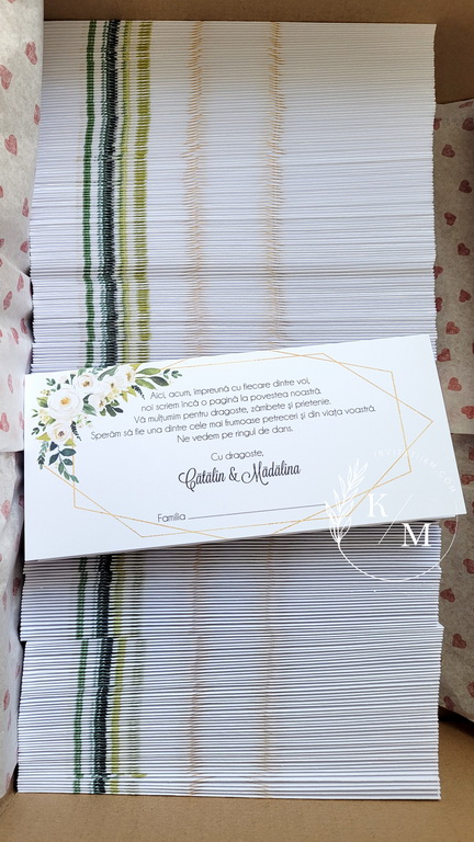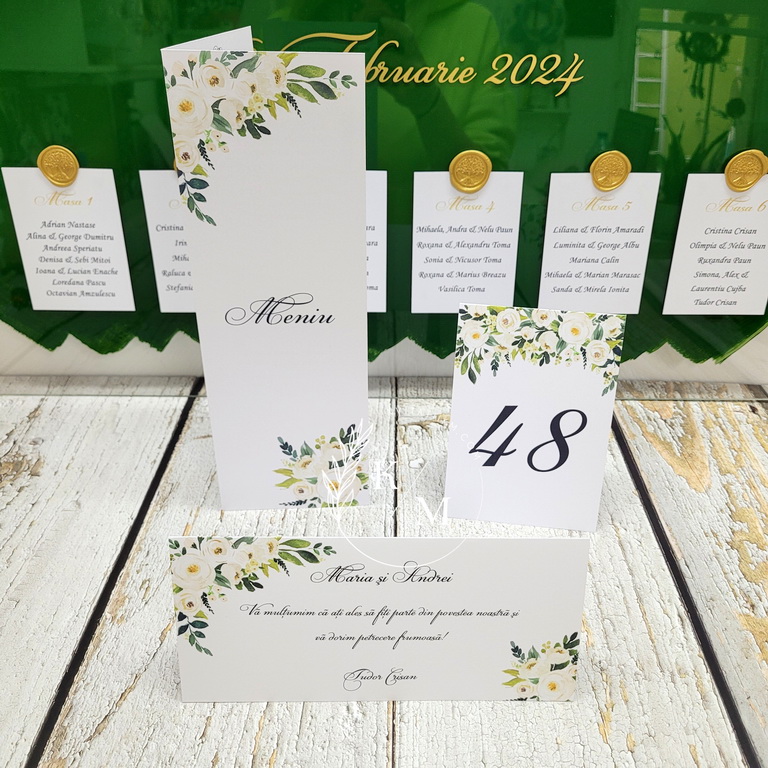 Meniuri si numere de masa, plicuri de bani cu flori albe, ivory si verdeata. Meniurile de nunta sunt realizate din carton gros si au dimensiunea aprox. 10 x 20 cm (inchise). Plicurile de bani sunt realizate din carton gros si au buzunar interior lipit pentru dar. Numerele de masa sunt fata-verso si au aprox. 10 x 15 cm (inchise).