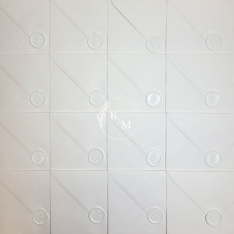 Invitatii de nunta minimaliste in nuante de alb-ivory, realizate din carton alb cald texturat, print simplu negru pe o fata, accesorizate cu plicuri off white cu particule albe si sigilii din ceara alba.