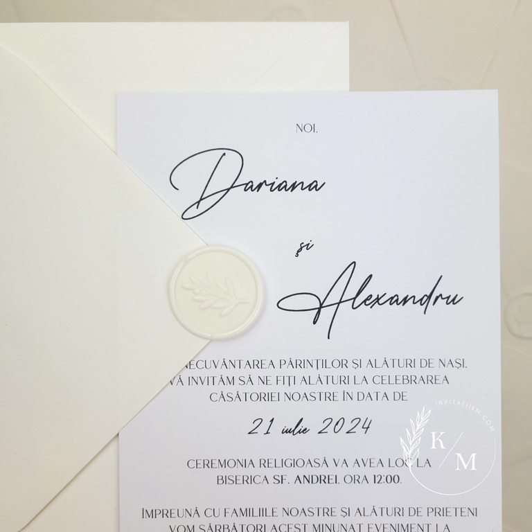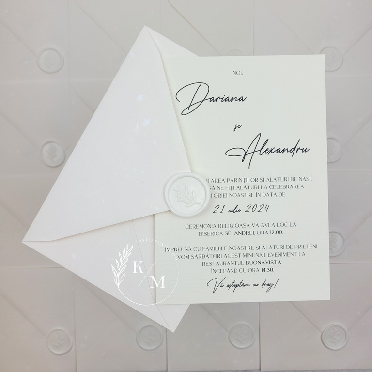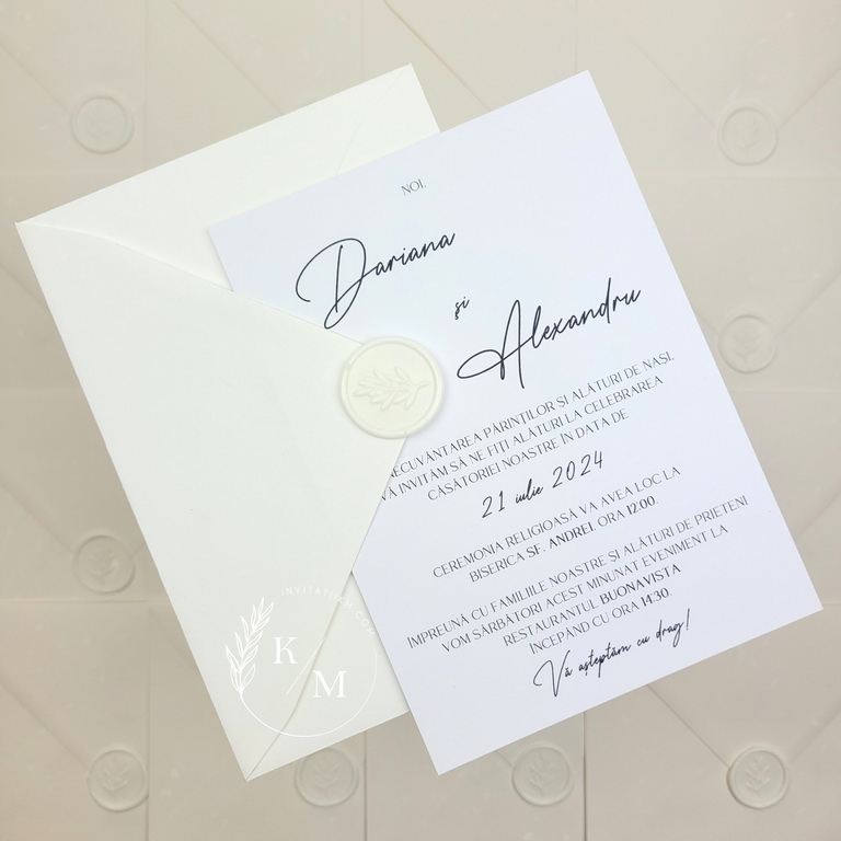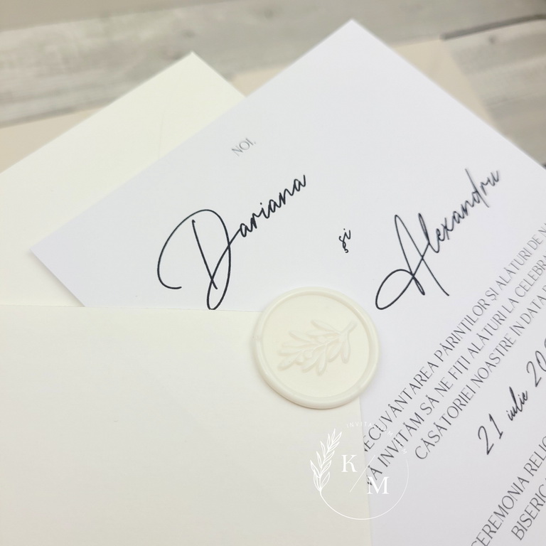 Invitatie de nunta minimalista in nuante de alb-ivory, realizata din carton alb neted, print simplu negru pe o singura fata, accesorizata cu plicuri albe si sigilii din ceara alba.