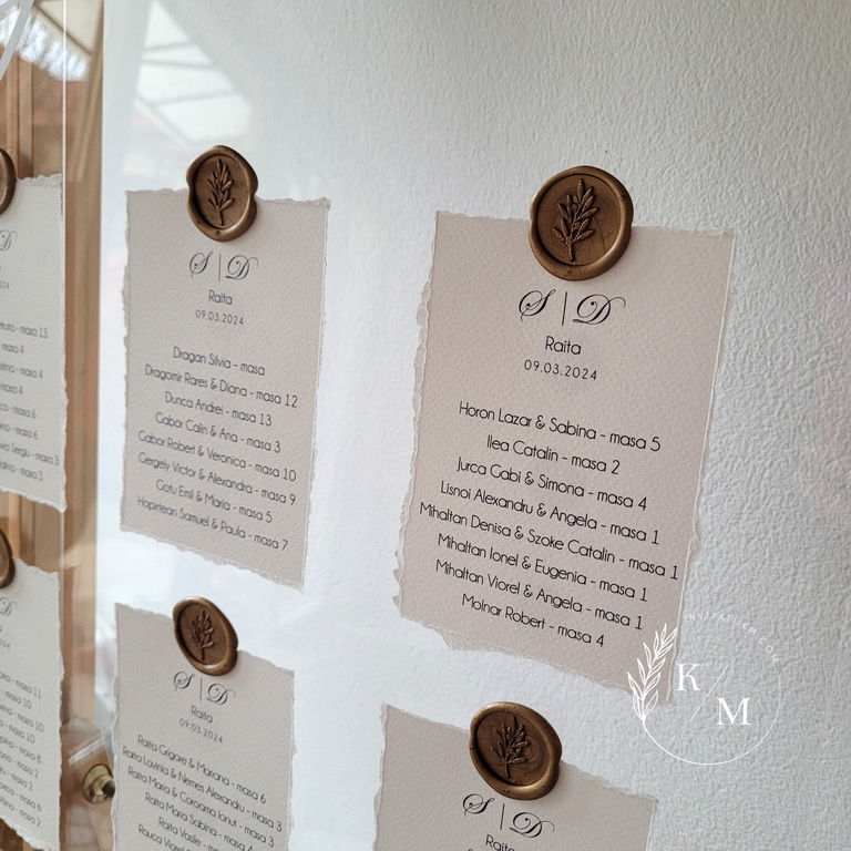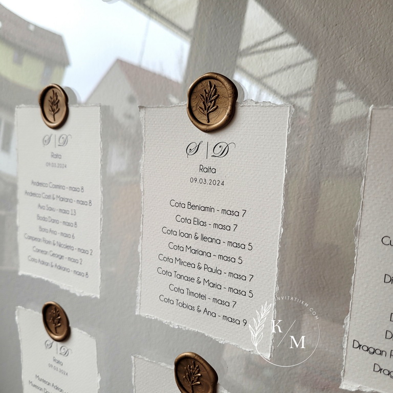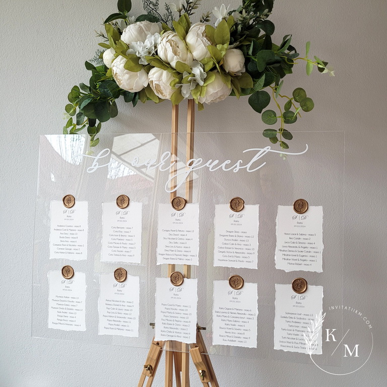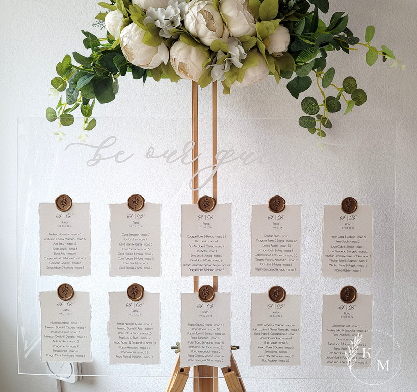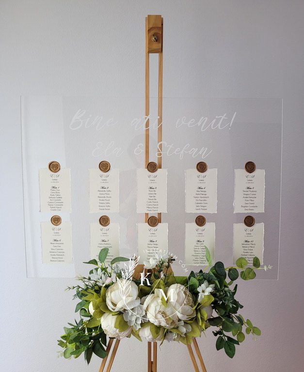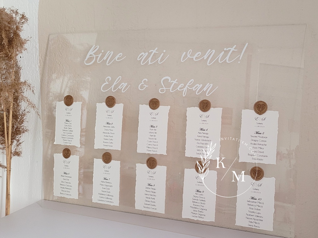 Panou de intampinare pentru nunta cu cartonase cu asezarea invitatilor la mese. Panoul este realizat din plexiglas transparent, are dimensiunea 50 x 70 cm, iar cartonasele sunt realizate din carton texturat cu marginile rupte manual + sigiliu. In functie de numarul cartonaselor, acestea pot fi mai mari/mai micute. Se pot achizitiona impreuna sau separat.