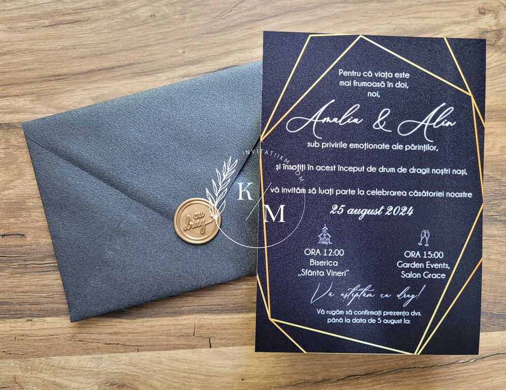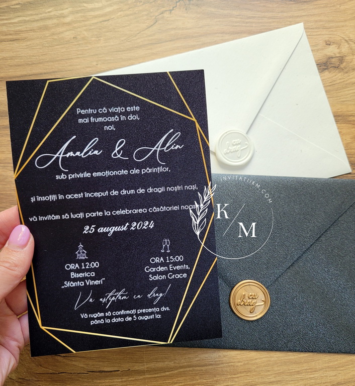 Invitatii de nunta negre cu detalii albe si aurii, accesorizate cu un plic alb sau negru si sigiliu.