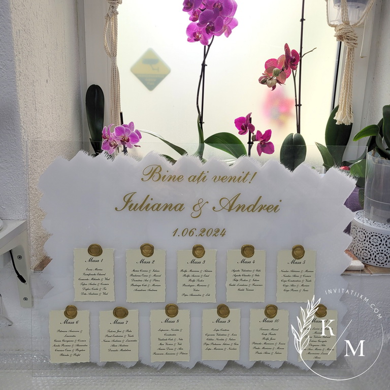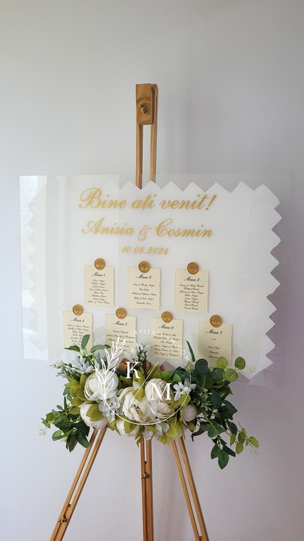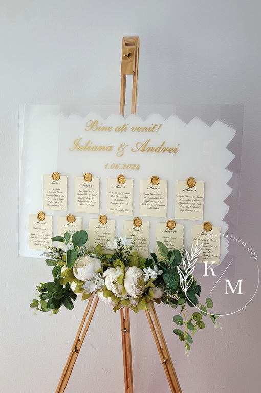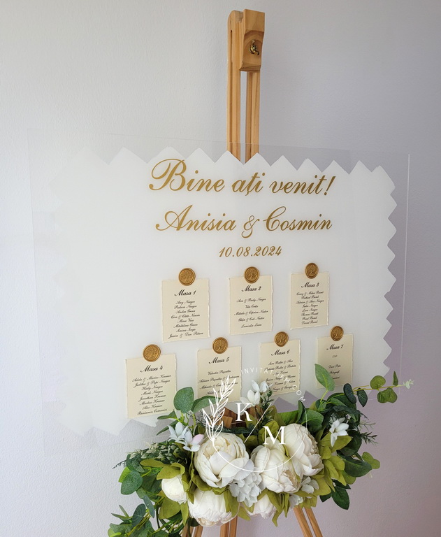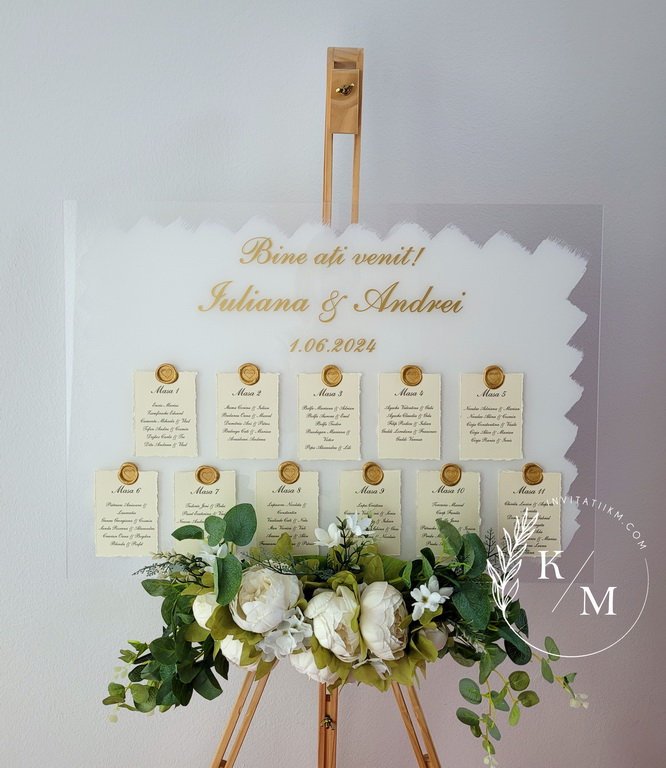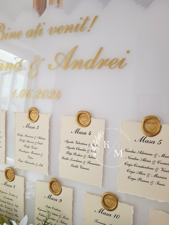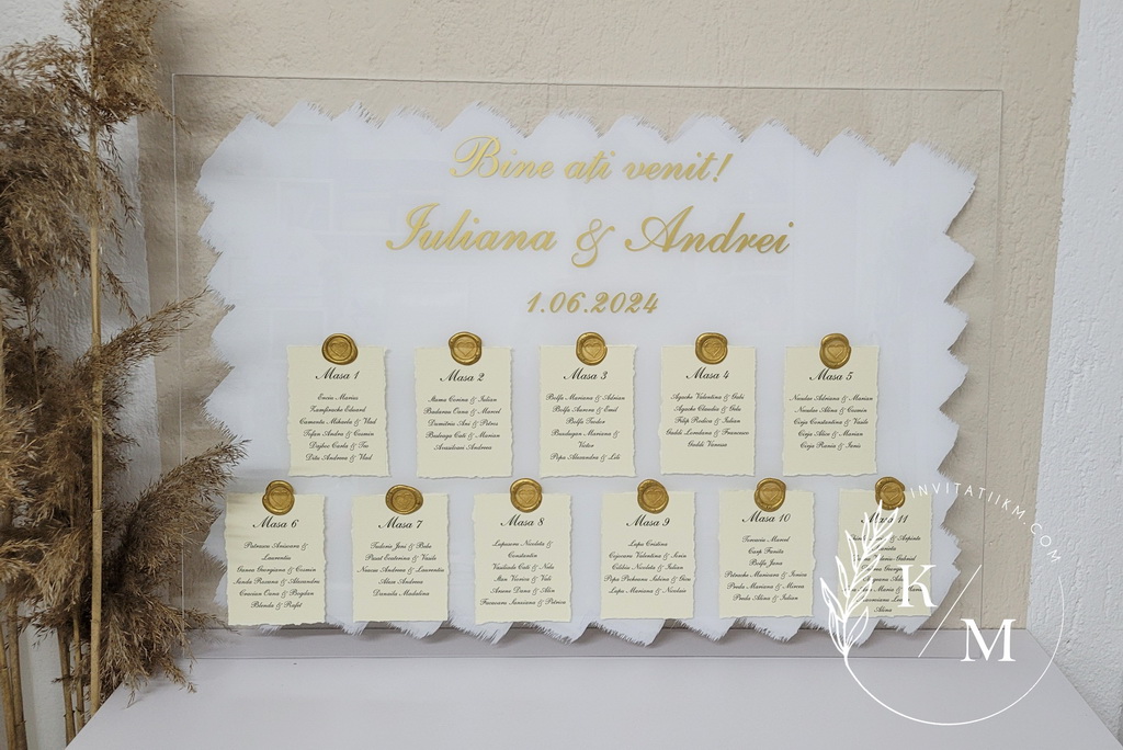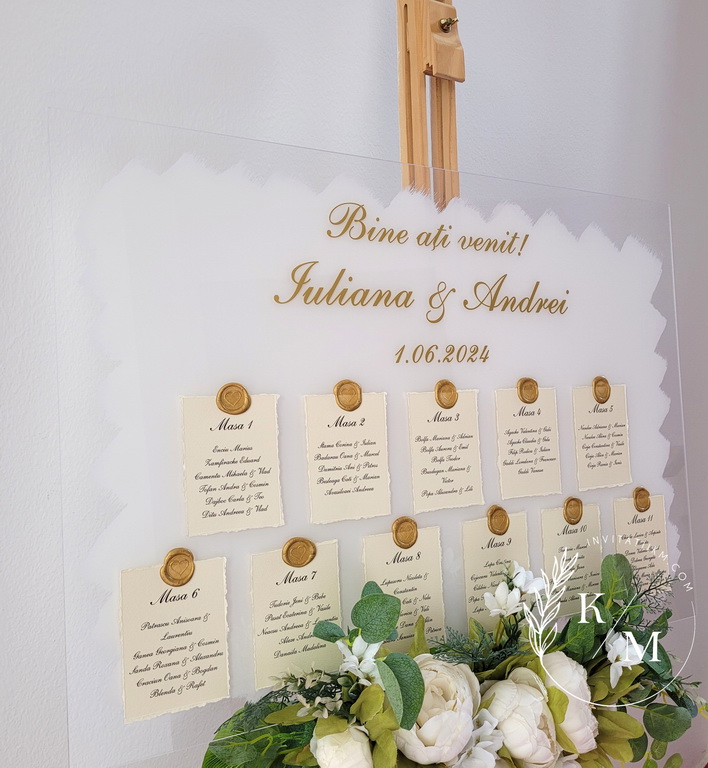 Panou de intampinare pentru nunta cu cartonase cu asezarea invitatilor la mese. Panoul este realizat din plexiglas transparent vopsit alb pe verso, are dimensiunea 50 x 70 cm, iar cartonasele sunt realizate din carton texturat cu margini rupte manual + sigiliu. In functie de numarul cartonaselor, acestea pot fi mai mari/mai micute. Se pot achizitiona impreuna sau separat.