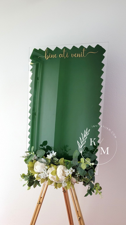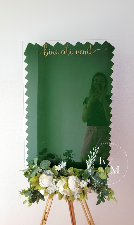 Panou de intampinare pentru nunta cu cartonase cu asezarea invitatilor la mese. Panoul este realizat din plexiglas transparent vopsit verde pe verso, are dimensiunea 50 x 70 cm, iar cartonasele se pot achizitiona separat.