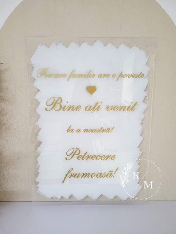 Panou de intampinare a invitatilor pentru nunta sau botez, realizat din plexiglas transparent, cu text din autocolant auriu si vopsit in diverse culori, nepersonalizat, cu textul “Fiecare familie are o poveste. Bine ati venit la a noastra!”