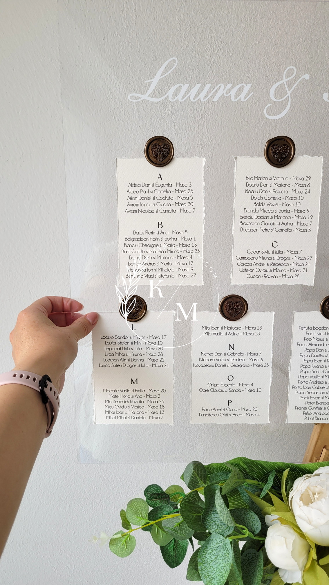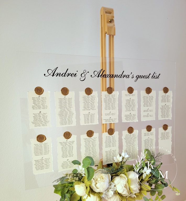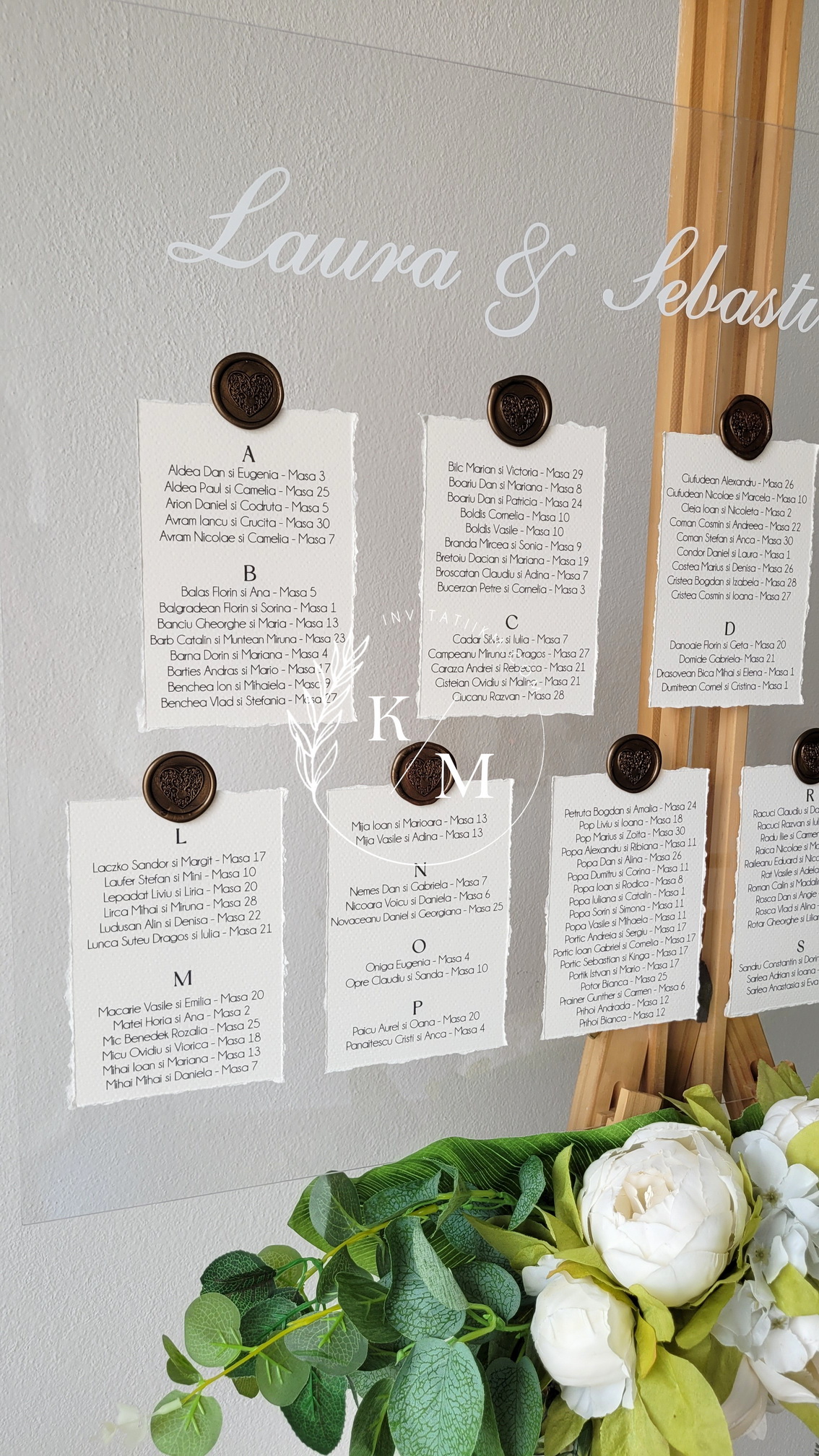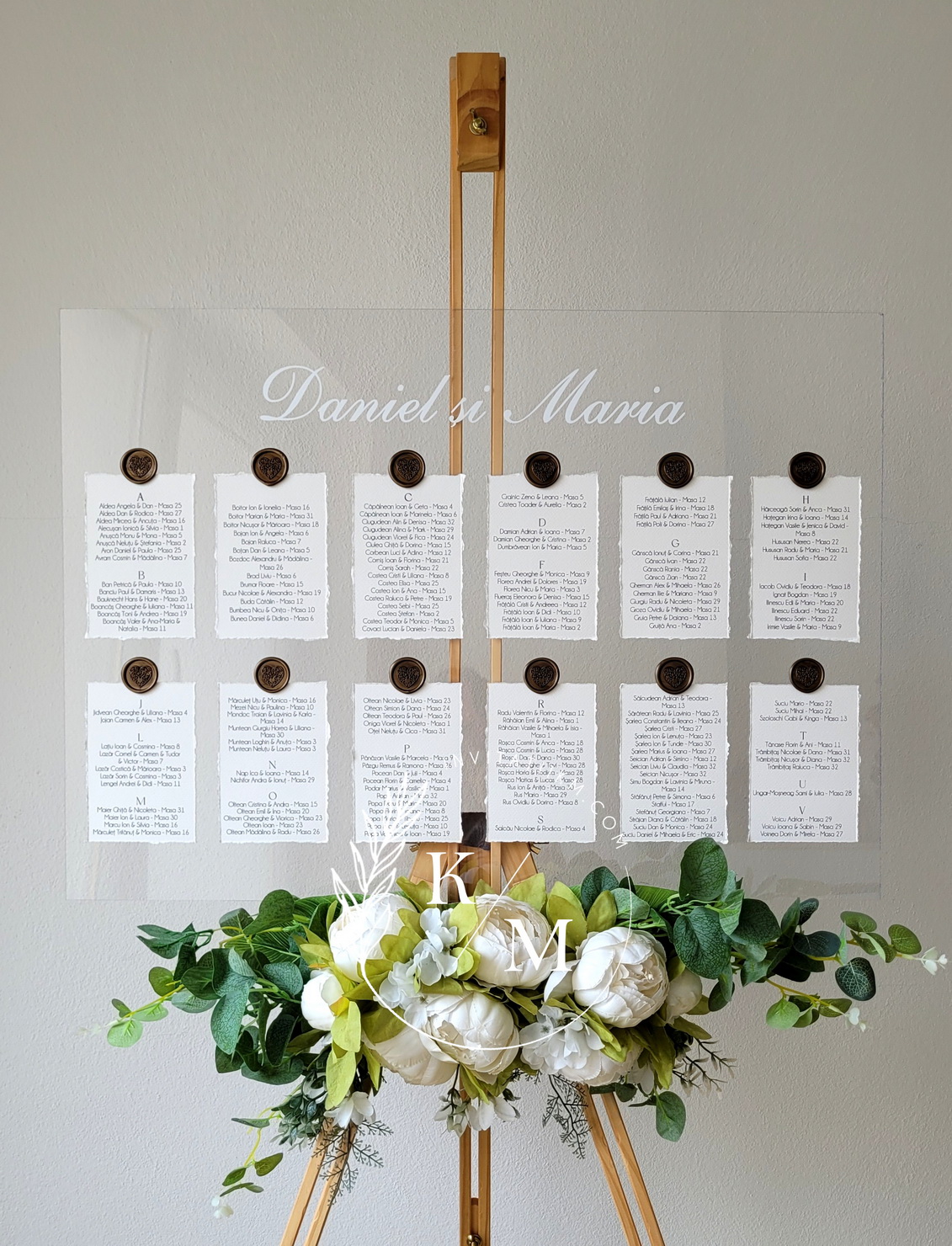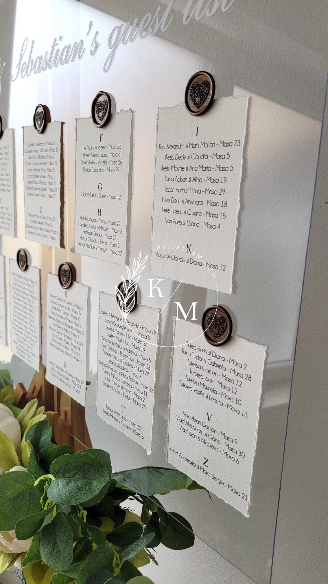 Panou de intampinare pentru nunta cu cartonase cu asezarea invitatilor la mese pentru 20-25 + mese – recomandam asezarea invitatilor in ordine alfabetica, pentru a se gasi mai usor pe liste. Panoul este realizat din plexiglas transparent, are dimensiunea 50 x 70 cm, iar cartonasele sunt realizate din carton texturat cu marginile rupte manual + sigiliu. In functie de numarul cartonaselor, acestea pot fi mai mari/mai micute. Se pot achizitiona impreuna sau separat.