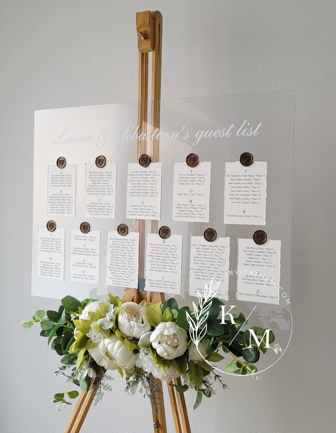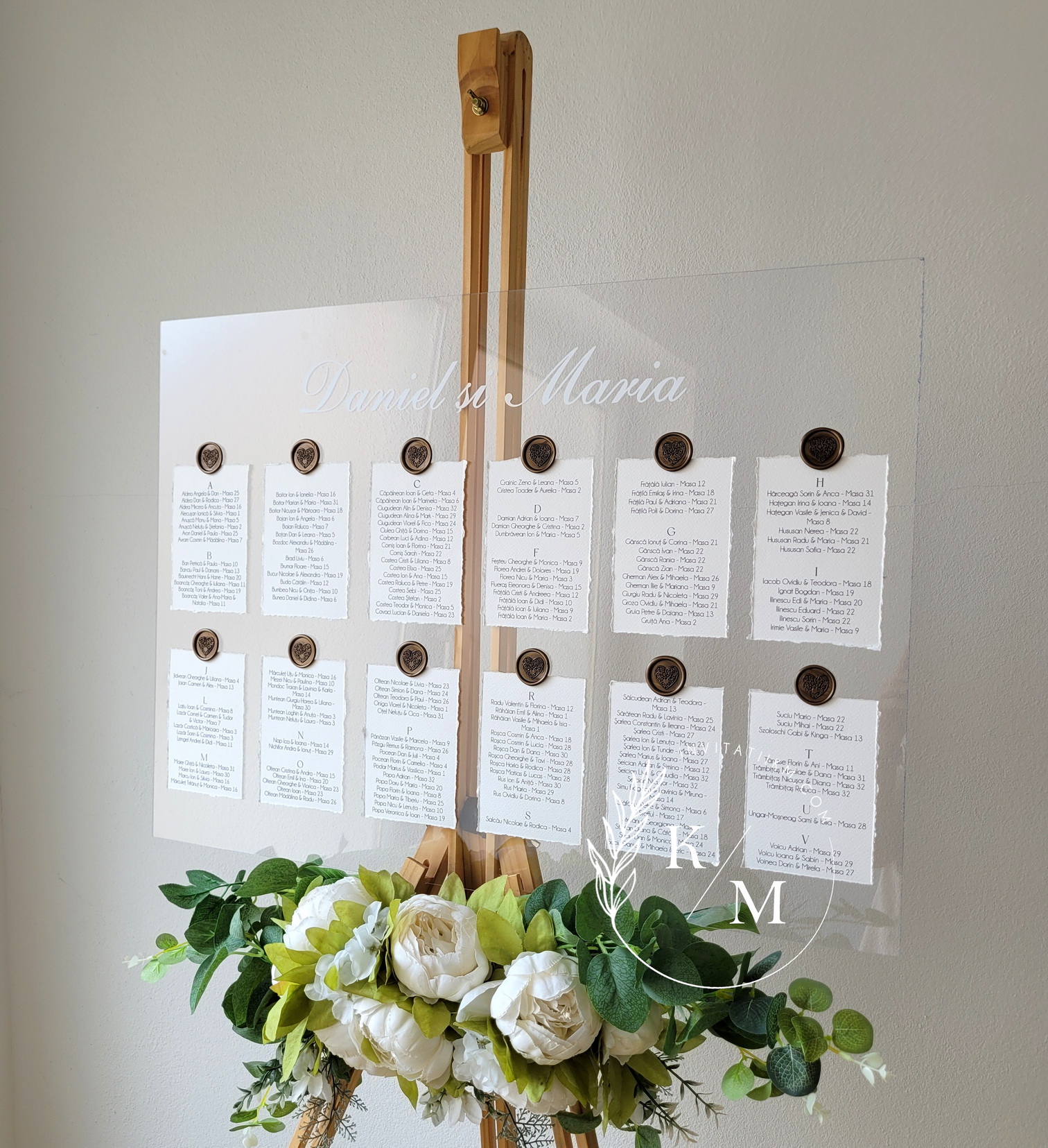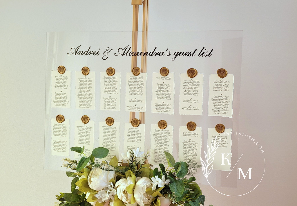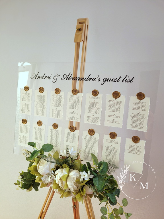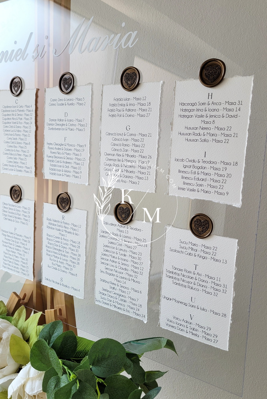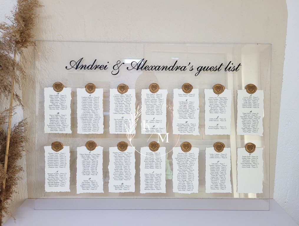 Panou de intampinare pentru nunta cu cartonase cu asezarea invitatilor la mese pentru 20-25 + mese – recomandam asezarea invitatilor in ordine alfabetica, pentru a se gasi mai usor pe liste. Panoul este realizat din plexiglas transparent, are dimensiunea 50 x 70 cm, iar cartonasele sunt realizate din carton texturat cu marginile rupte manual + sigiliu. In functie de numarul cartonaselor, acestea pot fi mai mari/mai micute. Se pot achizitiona impreuna sau separat.