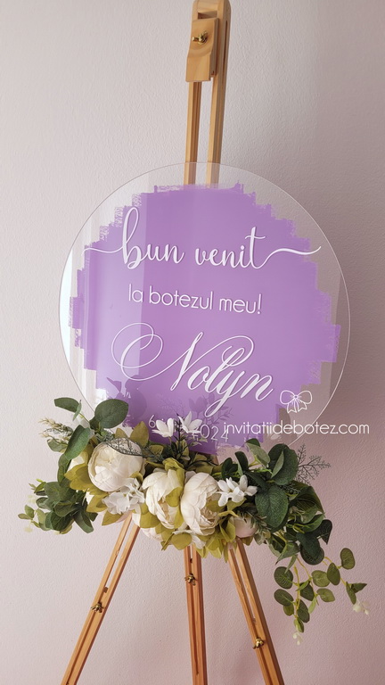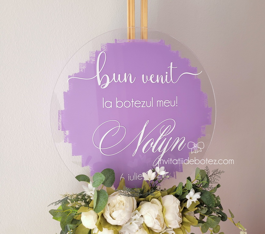 Panou de intampinare a invitatilor pentru nunta sau botez, realizat din plexiglas transparent, personalizat cu text din autocolant alb si vopsit lila. Mai multe produse pentru botez aici: https://invitatiidebotez.com/