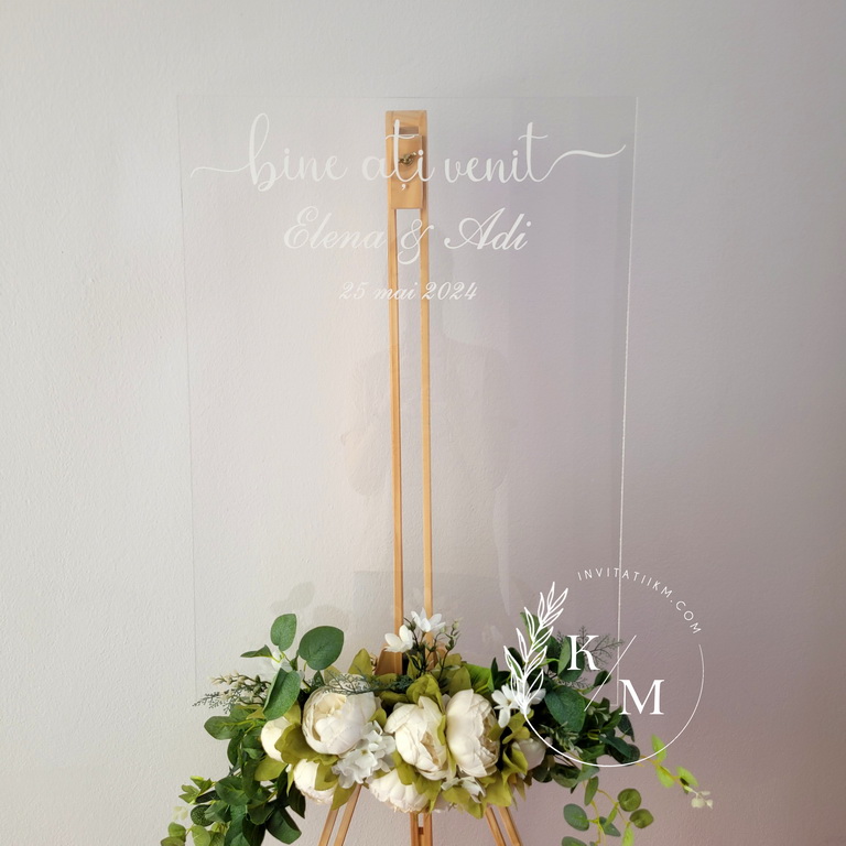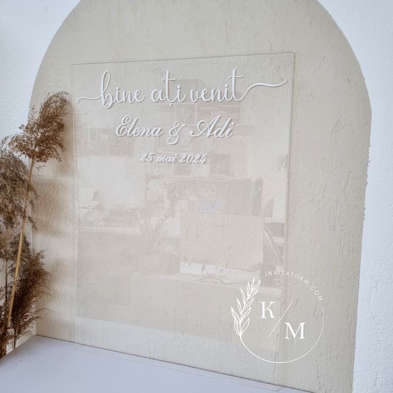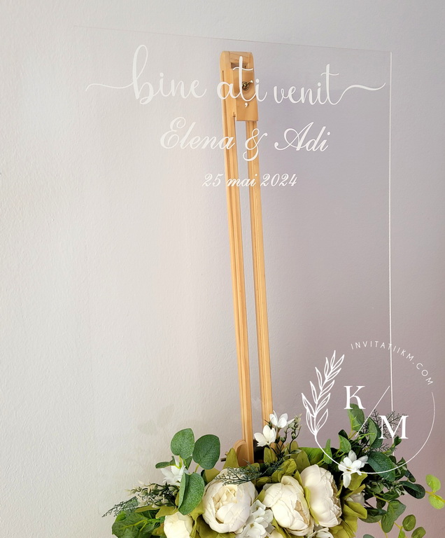 Panou de intampinare pentru nunta cu cartonase cu asezarea invitatilor la mese. Panoul este realizat din plexiglas transparent si are dimensiunea 50 x 70 cm.