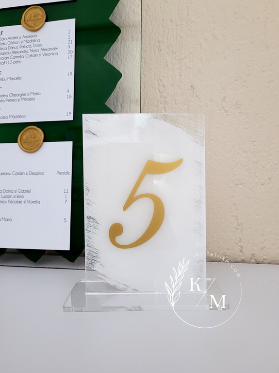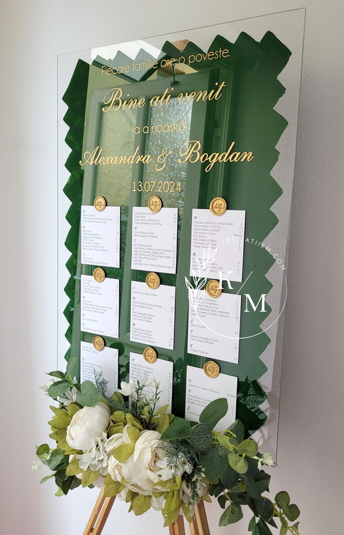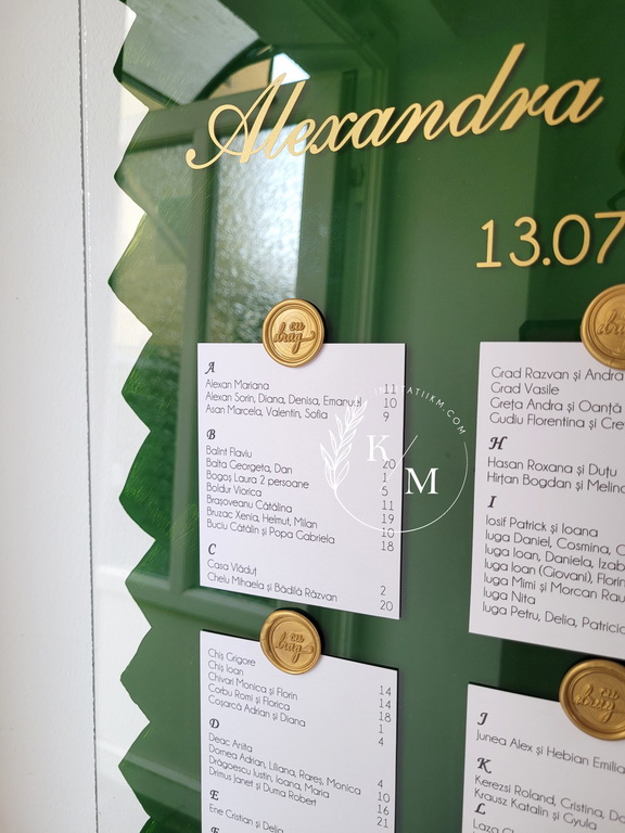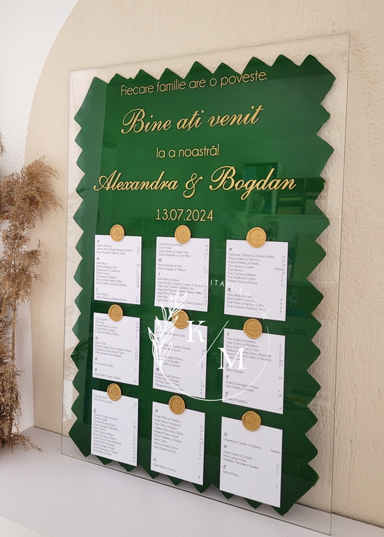 Panou de intampinare pentru nunta cu cartonase cu asezarea invitatilor la mese. Panoul este realizat din plexiglas transparent vopsit verde pe verso, are dimensiunea 50 x 70 cm, iar cartonasele sunt realizate din carton alb neted + sigiliu. In functie de numarul cartonaselor, acestea pot fi mai mari/mai micute. Se pot achizitiona impreuna sau separat.