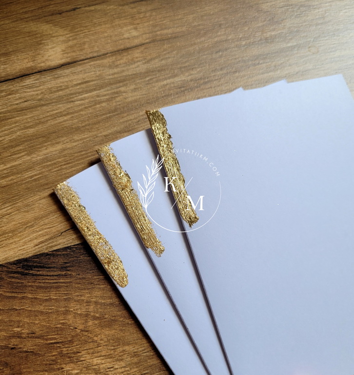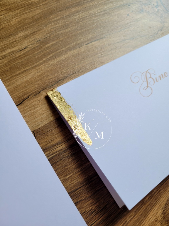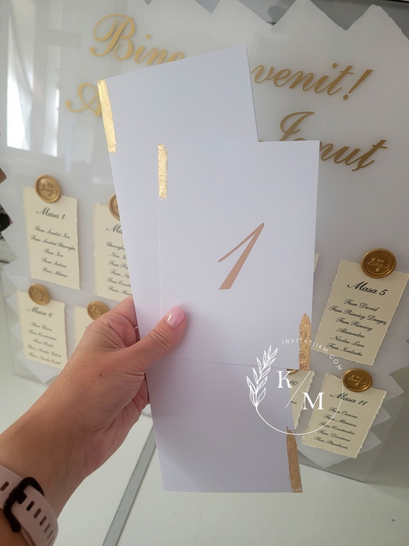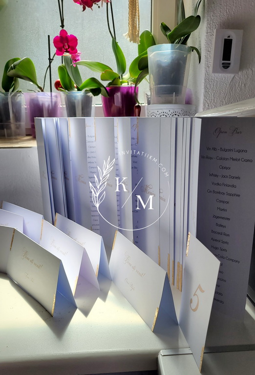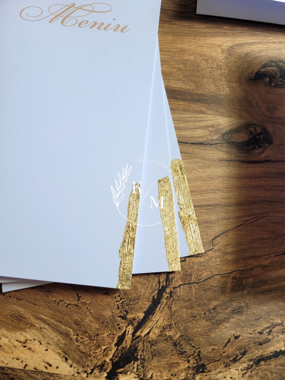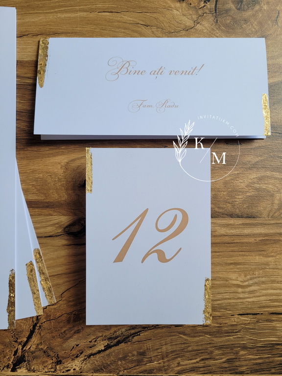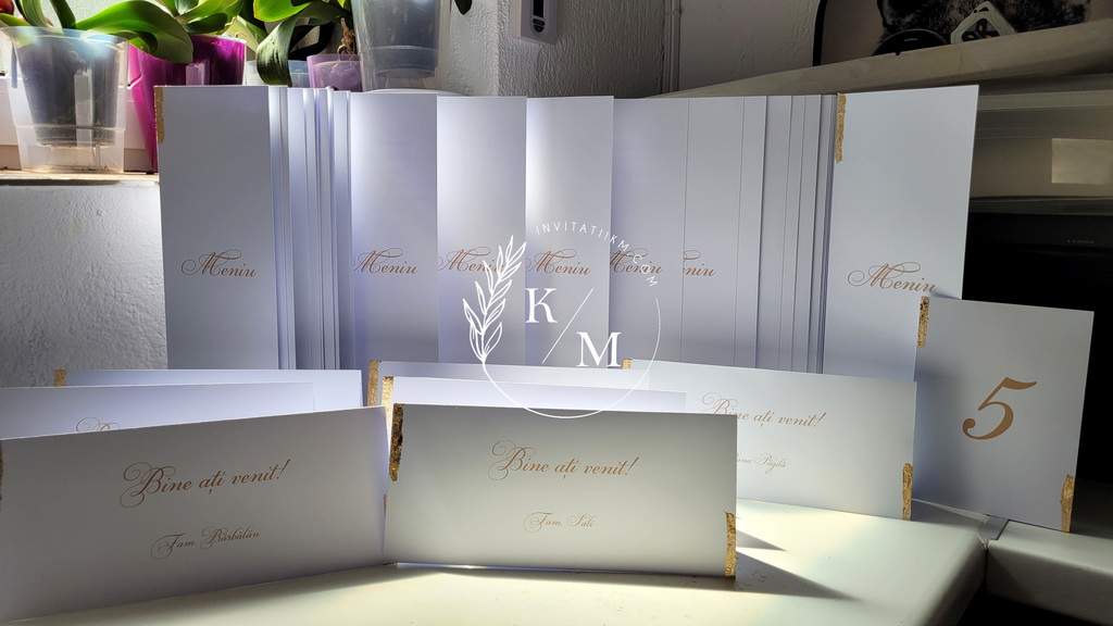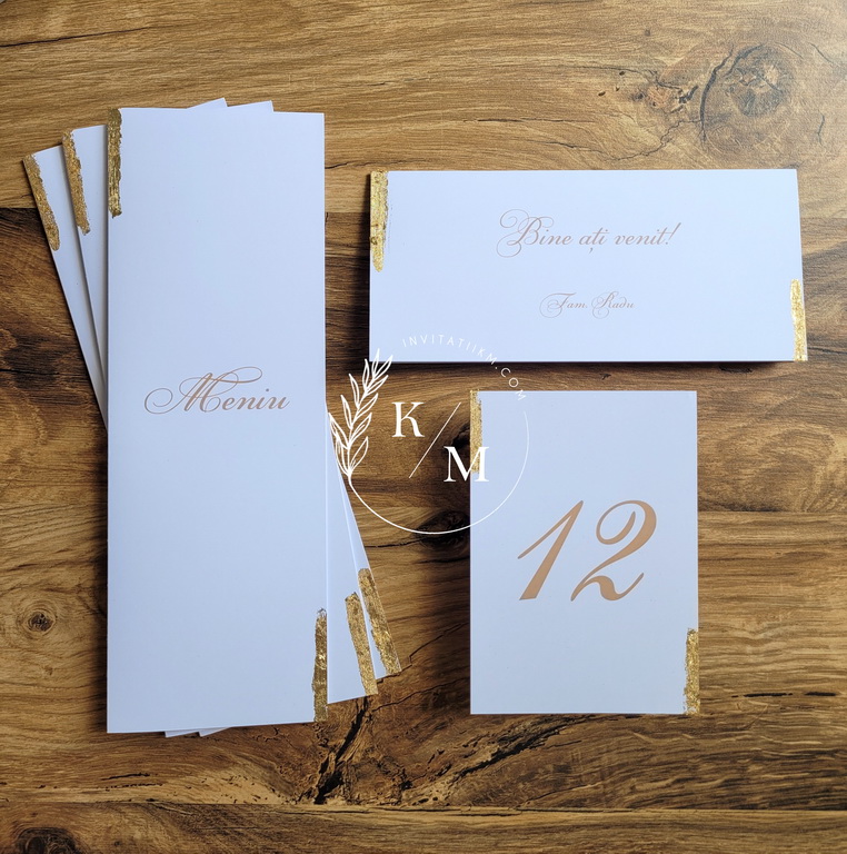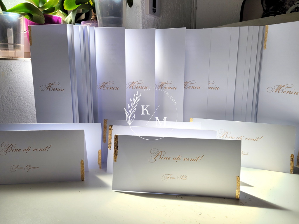 Meniuri de nunta, numere de masa, plicuri de bani/carduri de asezare cu detalii aurii aplicate manual, realizate cu foita aurie