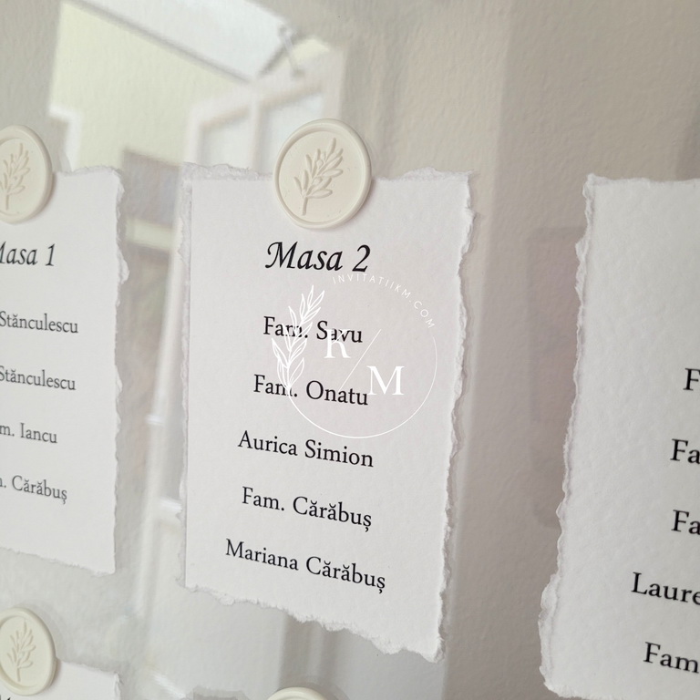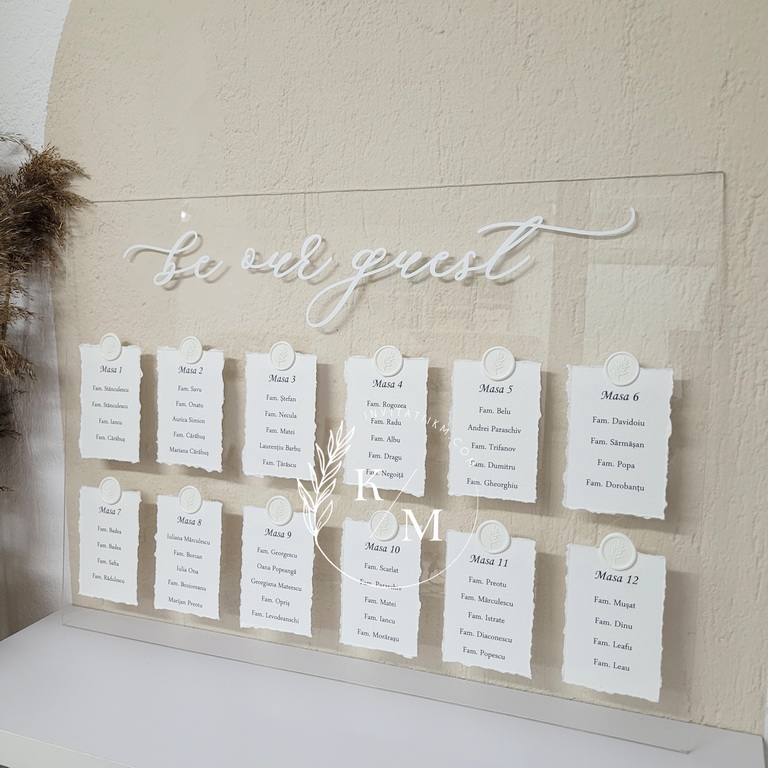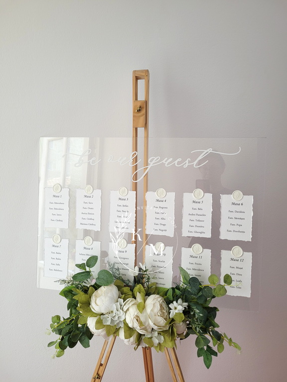 Panou de intampinare pentru nunta cu cartonase cu asezarea invitatilor la mese. Panoul este realizat din plexiglas transparent, are dimensiunea 50 x 70 cm, iar cartonasele sunt realizate din carton texturat cu marginile rupte manual + sigiliu. In functie de numarul cartonaselor, acestea pot fi mai mari/mai micute. Se pot achizitiona impreuna sau separat.