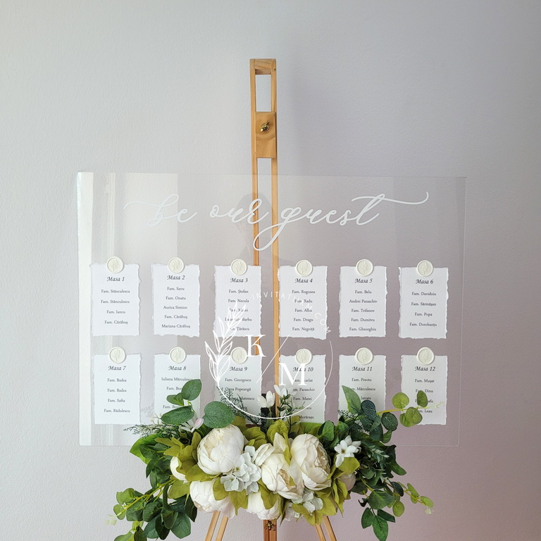 Panou de intampinare pentru nunta cu cartonase cu asezarea invitatilor la mese. Panoul este realizat din plexiglas transparent, are dimensiunea 50 x 70 cm, iar cartonasele sunt realizate din carton texturat cu marginile rupte manual + sigiliu. In functie de numarul cartonaselor, acestea pot fi mai mari/mai micute. Se pot achizitiona impreuna sau separat.