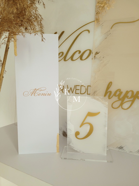 Numar de masa pentru nunta sau botez realizat din plexiglas transparent, autocolant auriu mat, vopsit pe verso in diferite culori, dimensiune aprox. 10 x 15 cm