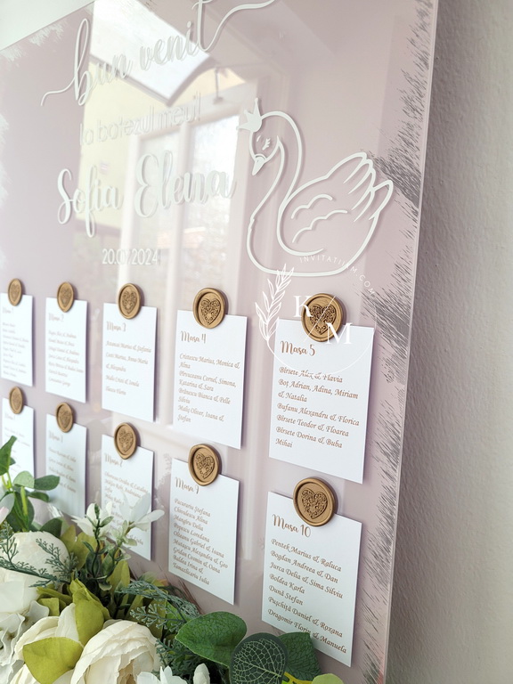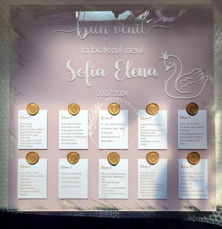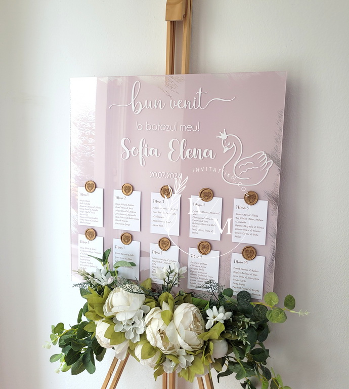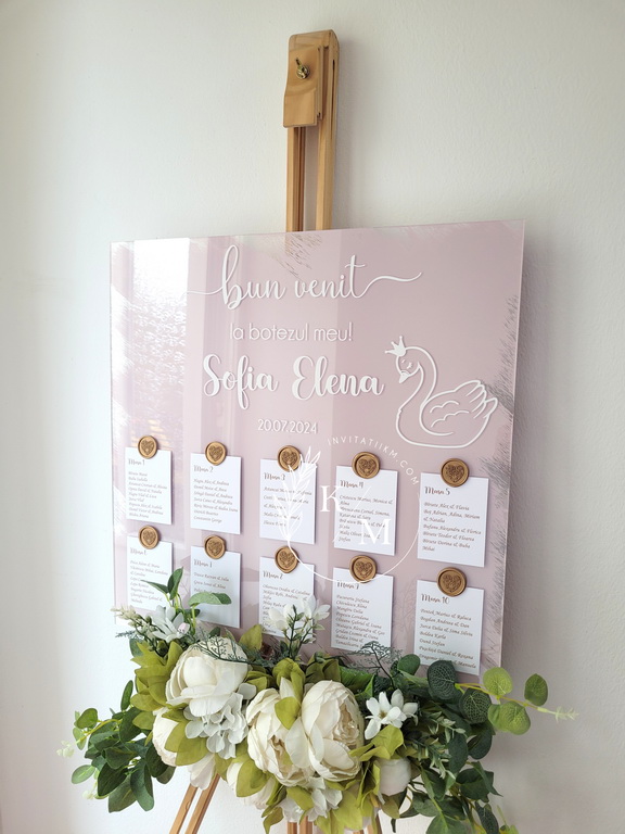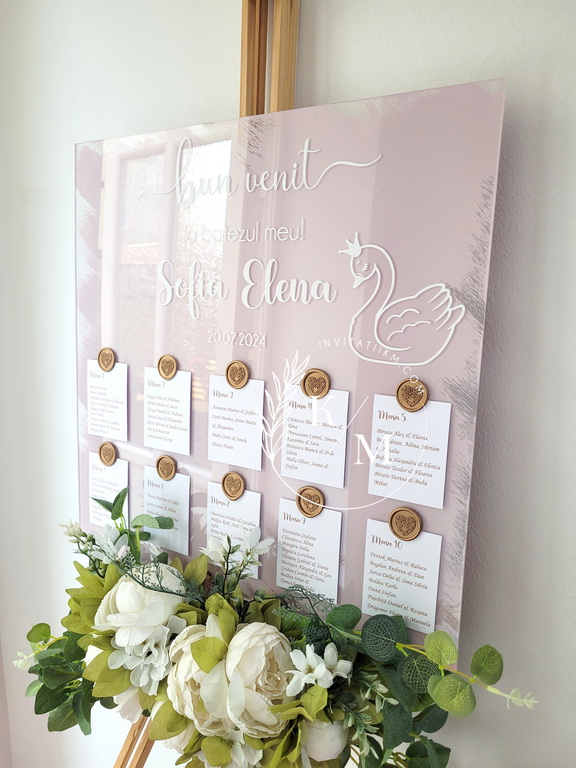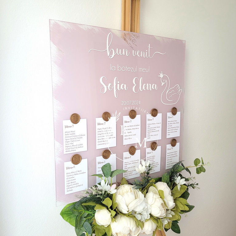 Panou de intampinare pentru botez si cartonase cu asezarea invitatilor la mese. Panoul este realizat din plexiglas transparent vopsit roz antic/roz vintage pe verso, are dimensiunea 50 x 50 cm, iar cartonasele sunt realizate din carton alb neted + sigiliu. In functie de numarul cartonaselor, acestea pot fi mai mari/mai micute. Se pot achizitiona impreuna sau separat. Mai multe produse pentru botez aici: https://invitatiidebotez.com/