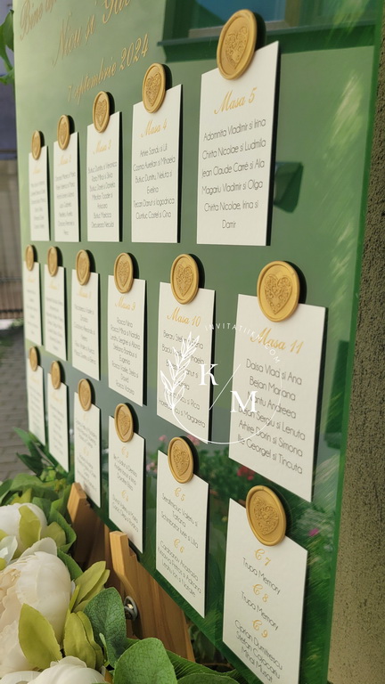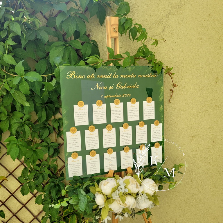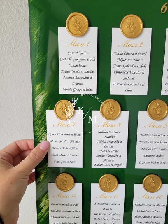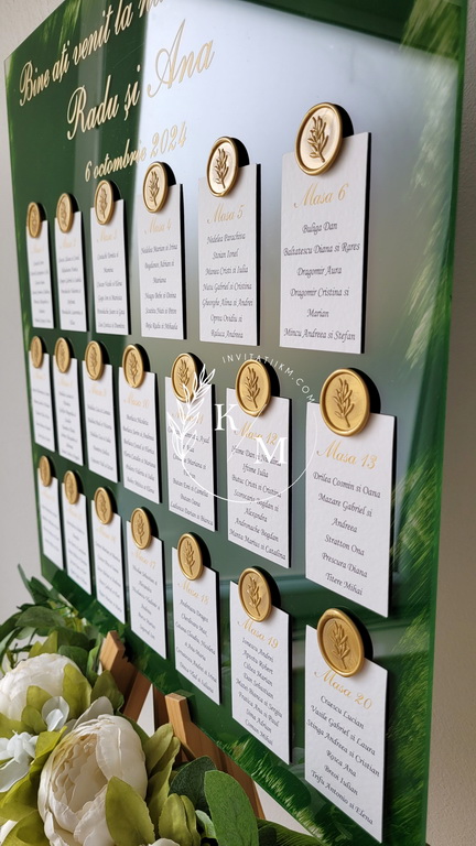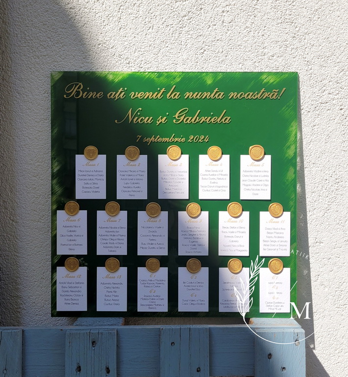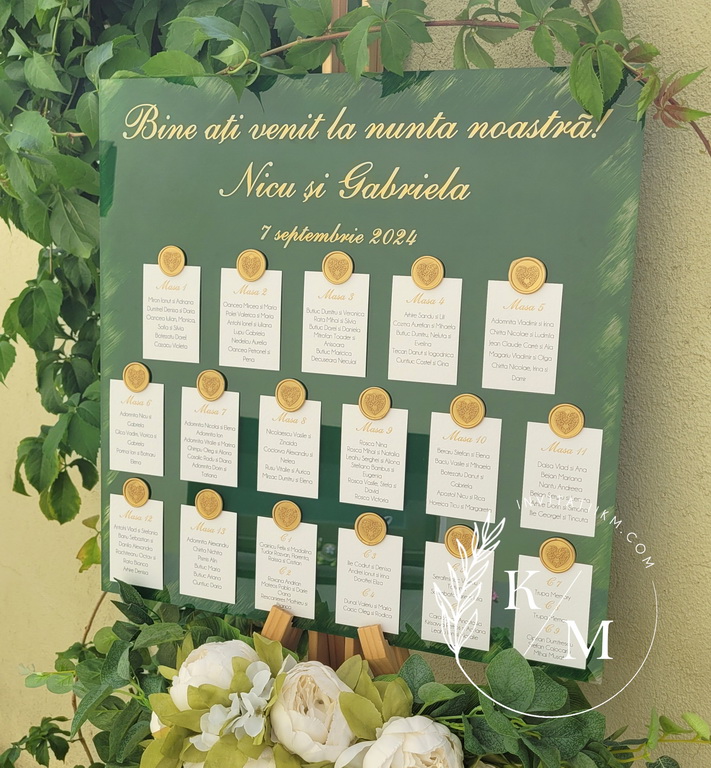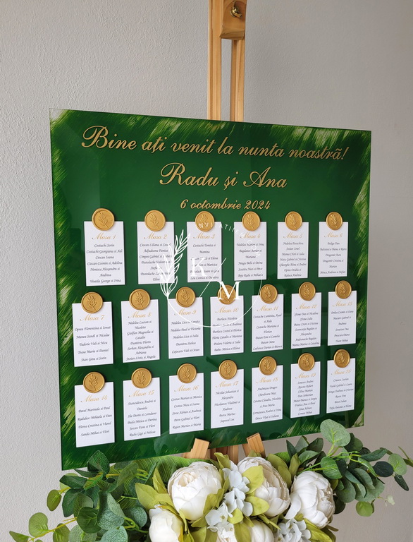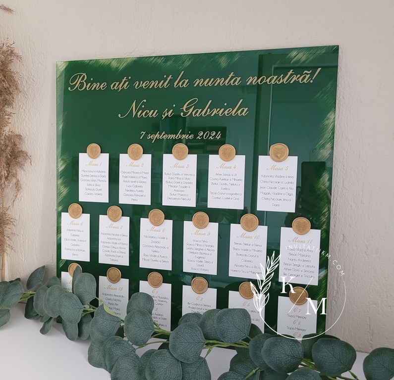 Panou de intampinare pentru nunta cu cartonase cu asezarea invitatilor la mese. Panoul este realizat din plexiglas transparent vopsit verde pe verso, are dimensiunea 50 x 50 cm, iar cartonasele sunt realizate din carton alb neted + sigiliu. In functie de numarul cartonaselor, acestea pot fi mai mari/mai micute. Se pot achizitiona impreuna sau separat.